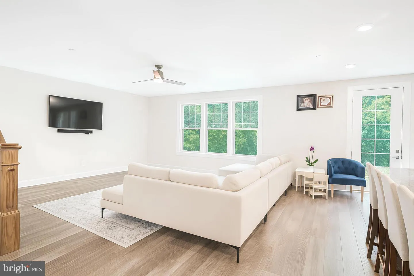 The centerpiece of the home is the stunning eat-in kitchen, complete with premium stainless steel appliances, elegant quartz countertops, and an oversized island with plenty of seating—perfect for cooking, gathering, and entertaining. The kitchen flows seamlessly into the inviting living area, creating a warm and welcoming space for family and guests.