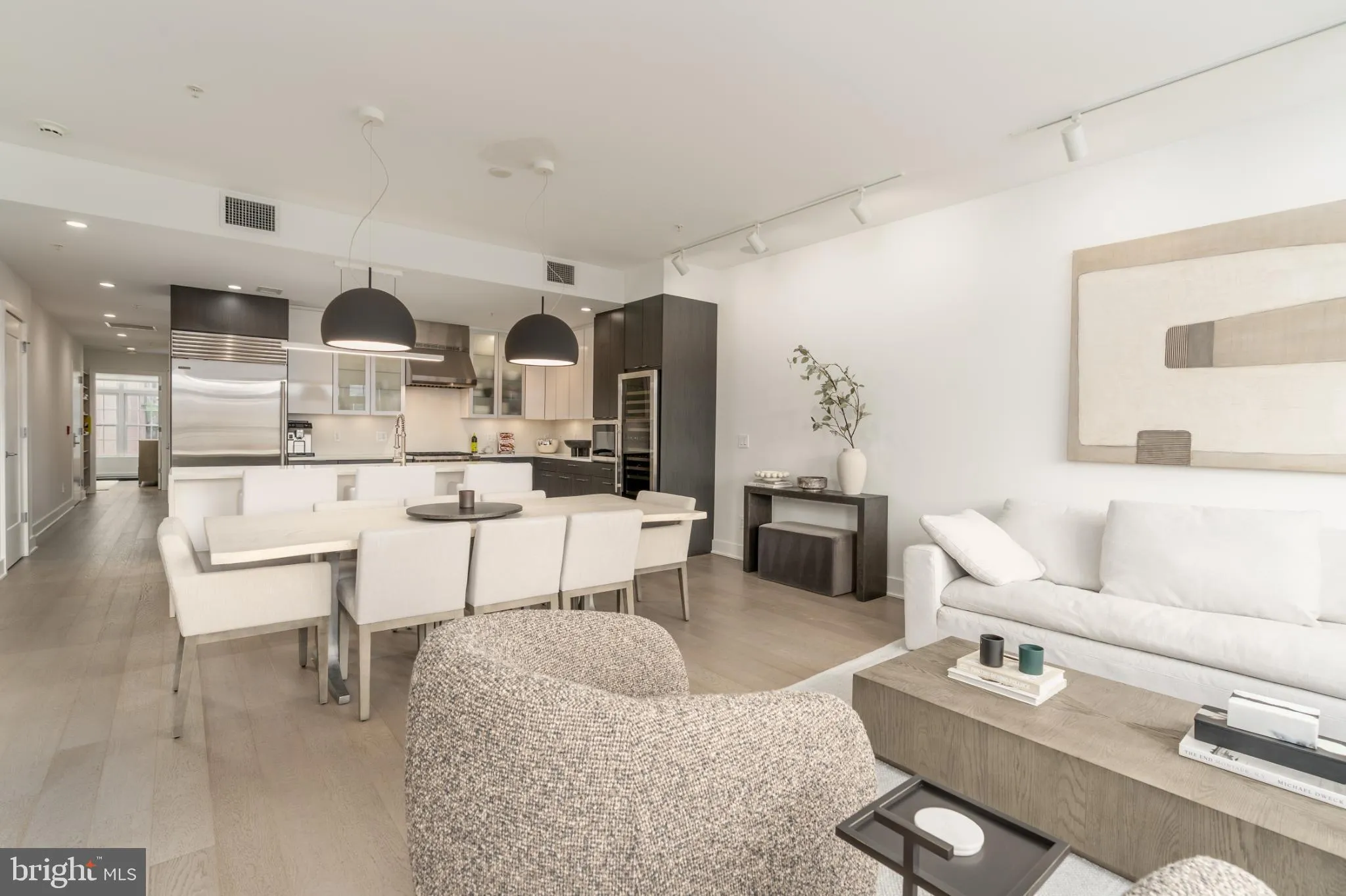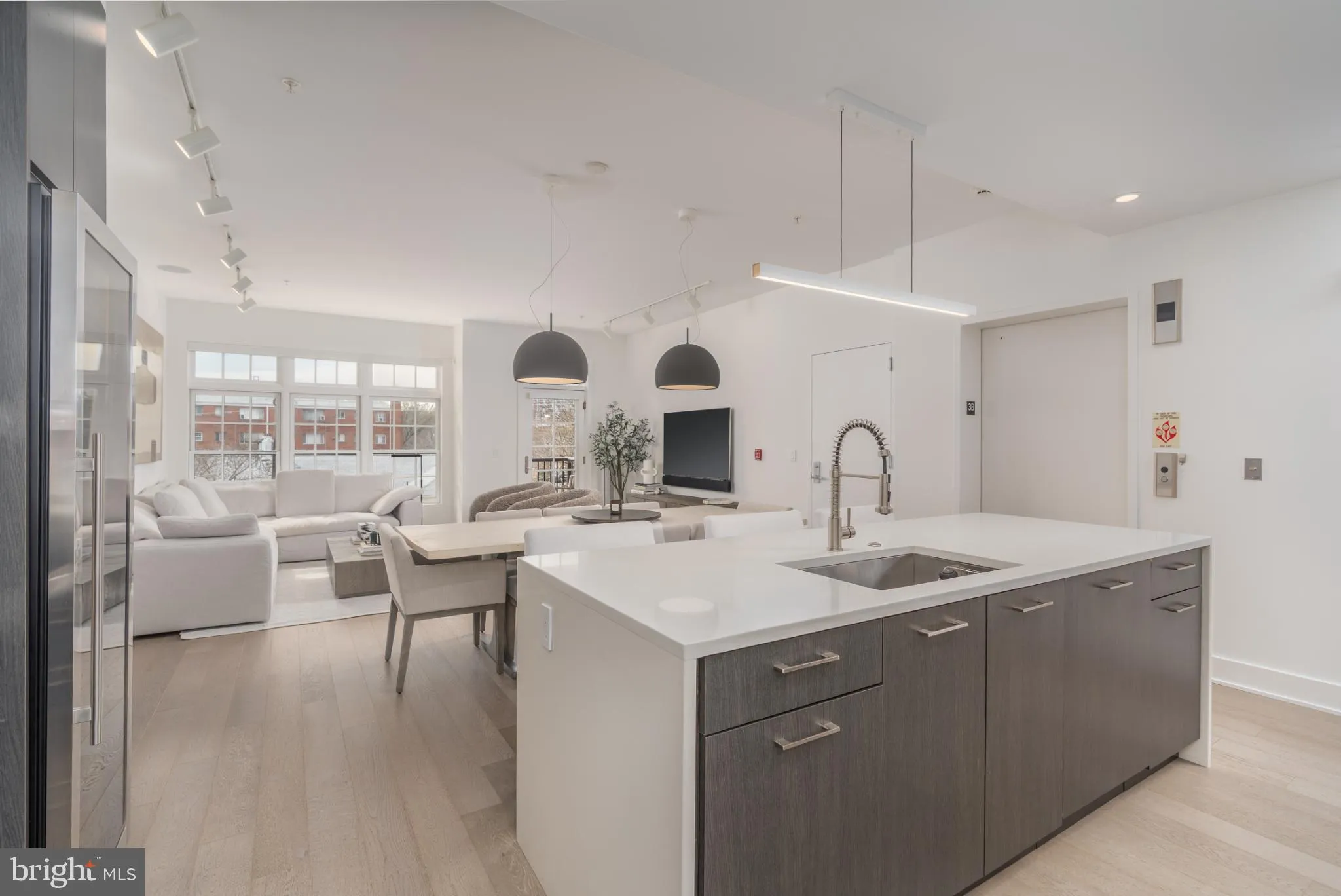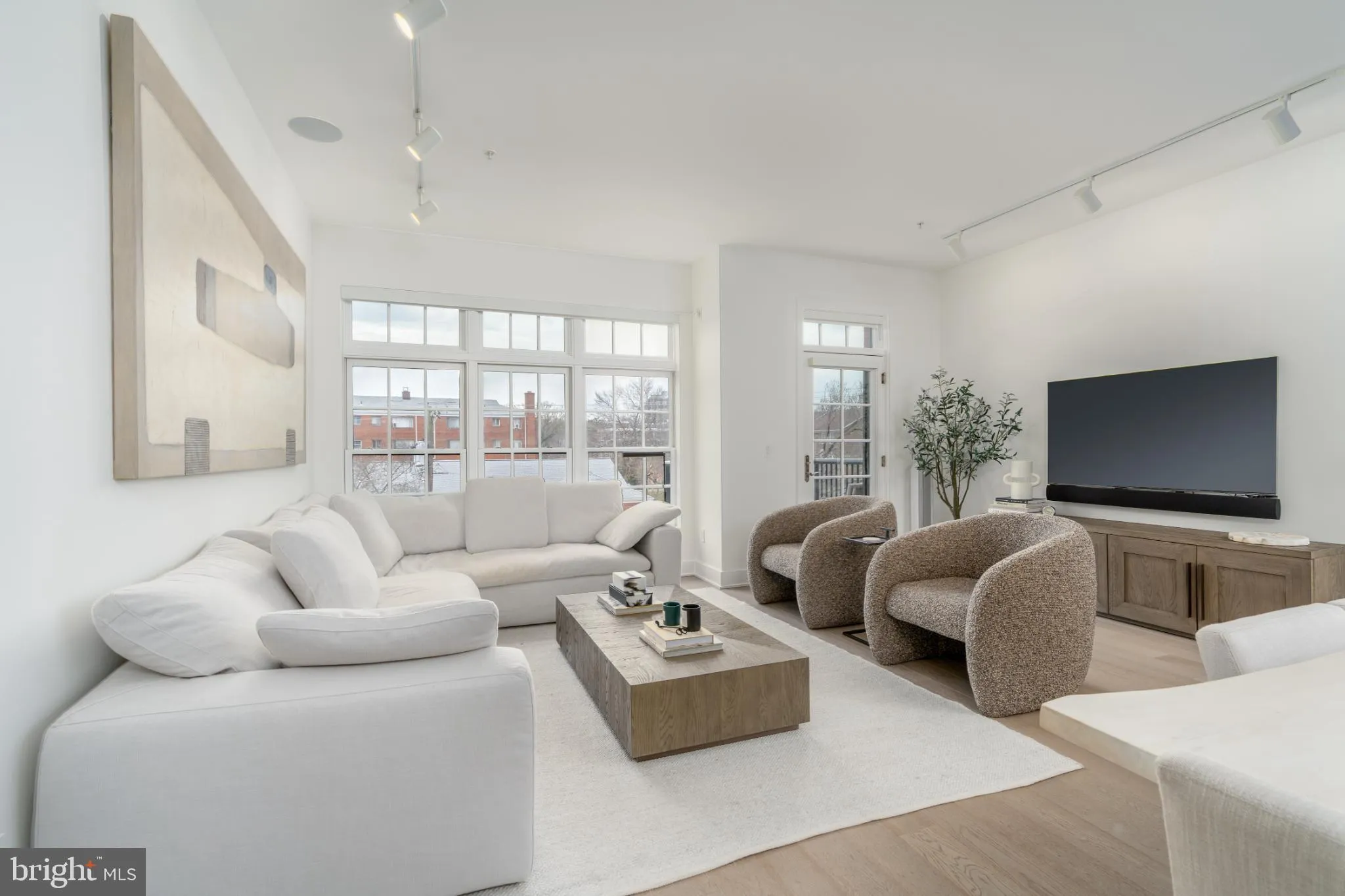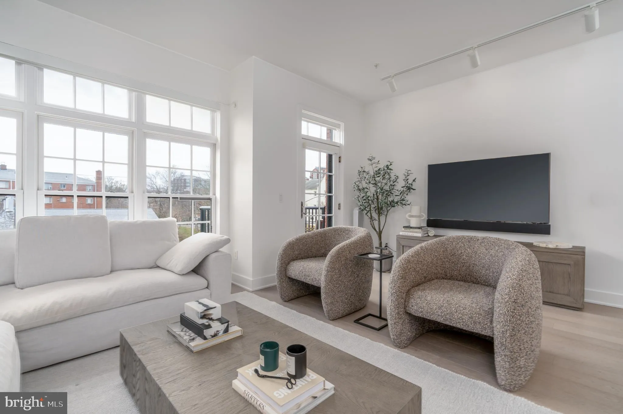 Residence 355 at The Select at Gaslight Square is a rare offering, delivering boutique luxury living in Arlington’s Rosslyn neighborhood with the best of urban convenience and charm. Just moments from Georgetown and the Metro with direct access to Washington, DC, this location places you at the center of it all. This rarely available, generously scaled two-bedroom, two-bathroom residence features direct elevator access into the unit, creating a private, secure, penthouse-style arrival experience that is exceptionally uncommon in the area. Soaring ceilings and expansive windows flood the home with natural light, highlighting oversized living and dining spaces designed for both everyday living and elegant entertaining. Hardwood flooring, designer lighting, architectural detailing, custom built-ins, and integrated surround sound create a refined yet welcoming environment. The spacious chef’s kitchen is appointed with Sub-Zero and Wolf appliances, quartz countertops, sleek cabinetry, and an extra-large wine refrigerator. Biluna S5 pendants by Italian designer Prandina anchor the dining area, while a contemporary island fixture enhances the home’s clean architectural lines. The primary suite offers a serene retreat, featuring Austere-W architectural wall lamps by Hans Verstuyft and a Haiku low-profile ceiling fan. Custom walk-in closet systems by Capital Closets. The en-suite bath delivers a spa-like experience with dual shower heads by Waterworks, modern finishes, and generous proportions. The secondary bedroom features a three-arm multi-light pendant inspired by Serge Mouille, bringing mid-century character to the space. A second full bathroom provides comfort and privacy for guests. A private balcony extends the living space outdoors and offers a quiet vantage point above the surrounding neighborhood. A newly installed Phantom retractable screen door allows fresh air circulation while maintaining comfort. The building’s corridor-free design ensures windows at both the front and rear of each residence. The courtyard view features landscaped gardens illuminated by the community’s signature gas lanterns. Recent enhancements include: Brand-new LG smart washer and dryer installed January 2026, Whole-home air purification system installed February 2026, 10-year combination smoke and carbon monoxide detectors. This rare offering also includes: Two secure indoor garage parking spaces with wall-mounted bicycle racks. Private storage unit. Boutique 2017 building with professional management and limited turnover. Move-in ready, Residence 355 offers privacy, scale, and modern design in one of Northern Virginia’s most desirable urban communities. Ideally positioned between the Rosslyn and Courthouse Metro stations and near restaurants, retail, fitness studios, and scenic running and biking trails, The Select at Gaslight Square delivers exceptional access and timeless appeal.