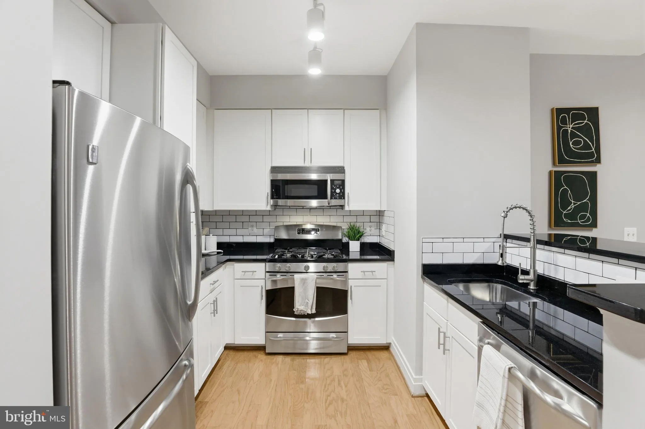 The updated chef’s kitchen features white shaker cabinets, black granite countertops, subway tile backsplash, and all stainless steel appliances. Both spacious bedrooms include large walk-in closets, offering plenty of storage.
