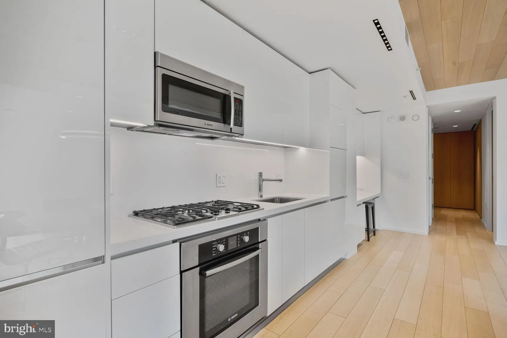 From the seventh floor, the living area and bedroom overlook the European-style plaza. Custom lighting and tailored wall paneling bring warmth, character, and function throughout. The kitchen features Molteni cabinetry, premium appliances, and clean contemporary lines. The bedroom is smartly designed and exceptionally quiet.