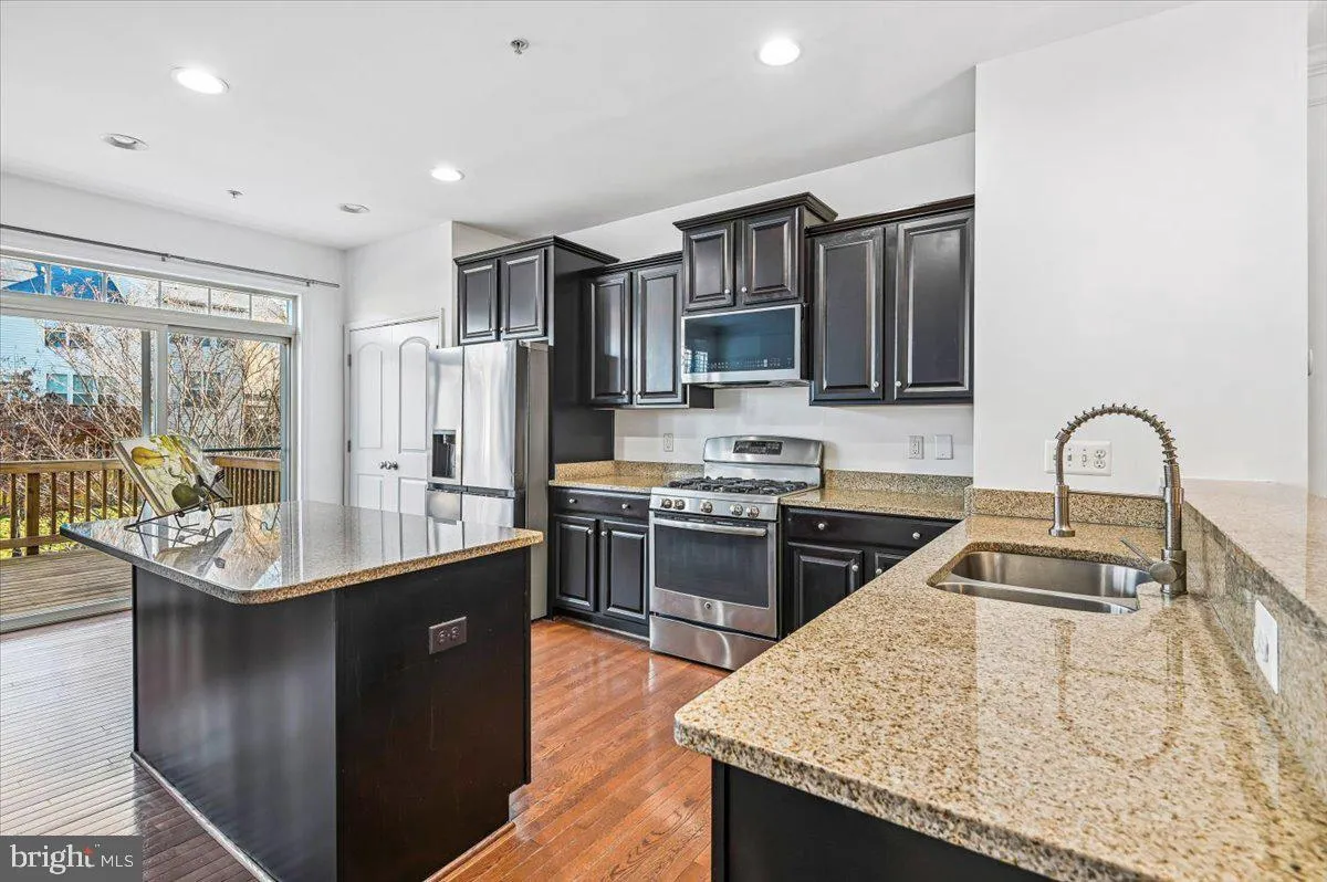 The kitchen features granite countertops, stainless steel appliances, a five-burner gas stove, and generous cabinet and counter space. A sliding glass door leads to the newly stained deck, creating the perfect space for outdoor dining or relaxing while overlooking the fully fenced backyard.
