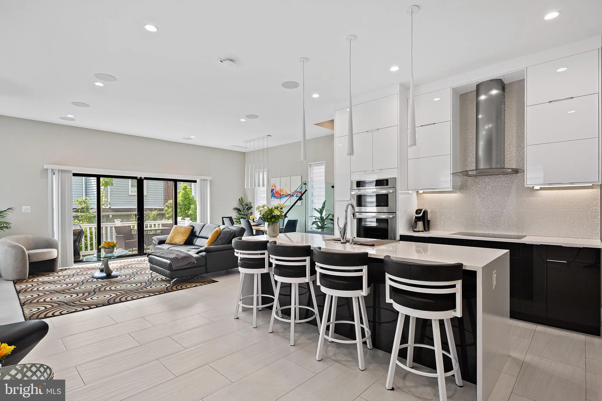 The main level is designed for both everyday living and entertaining, with an open-concept layout. The gourmet kitchen includes quartz countertops, stainless steel appliances, and a built-in wine and coffee bar with a Miele coffee machine. It opens directly to a comfortable living area with a fireplace, and French doors leading out to the rear deck—ideal for hosting or just relaxing.