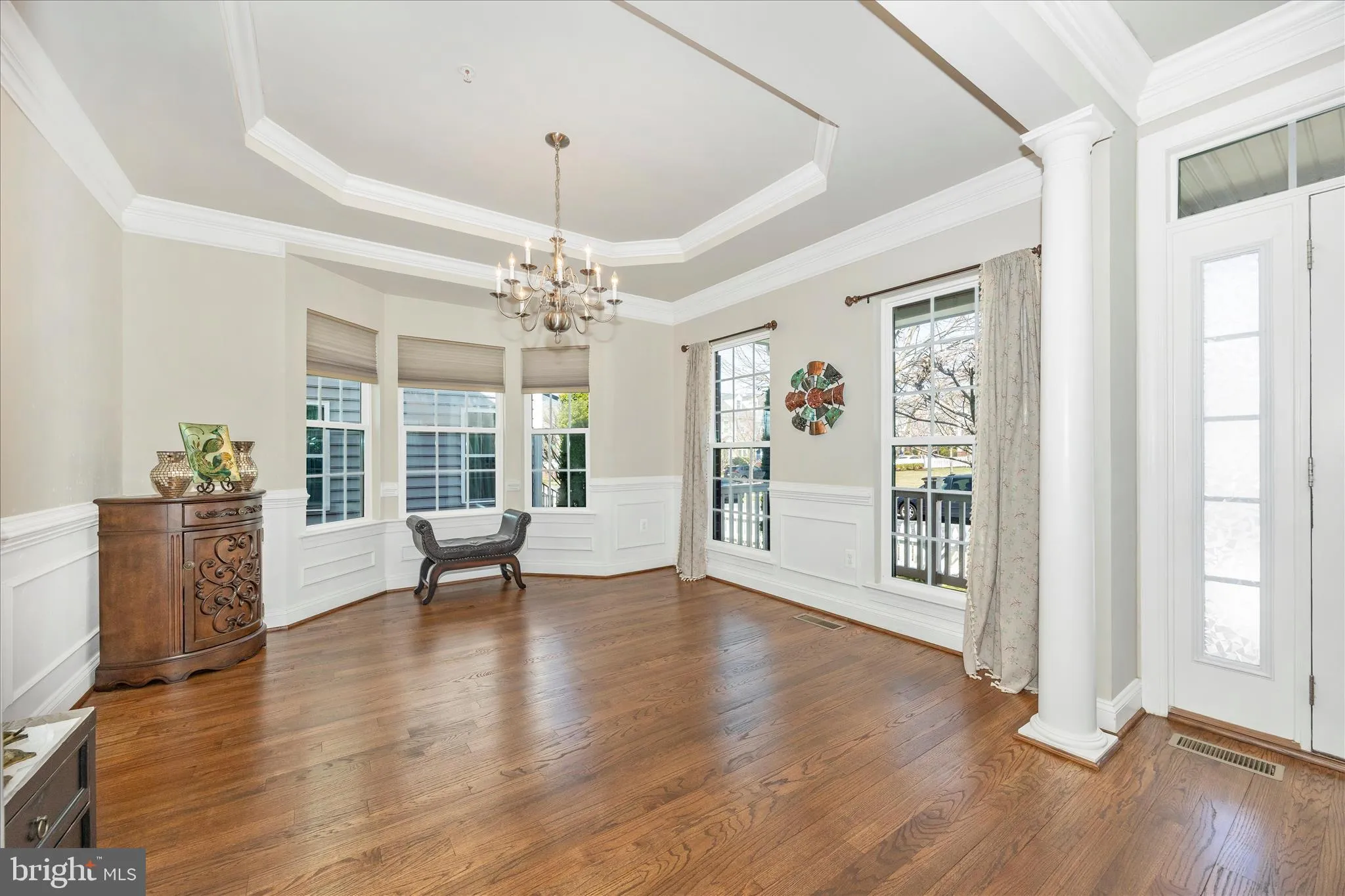 The main level offers a beautifully open layout, highlighted by rich hardwood flooring and refined architectural details throughout. The dining room makes an immediate impression with its tray ceiling, crown molding, chair rail, and picture molding—creating a sophisticated space perfect for hosting. A formal living room with crown molding adds versatility, while the spacious family room serves as the heart of the home, featuring a cozy gas fireplace with marble surround.