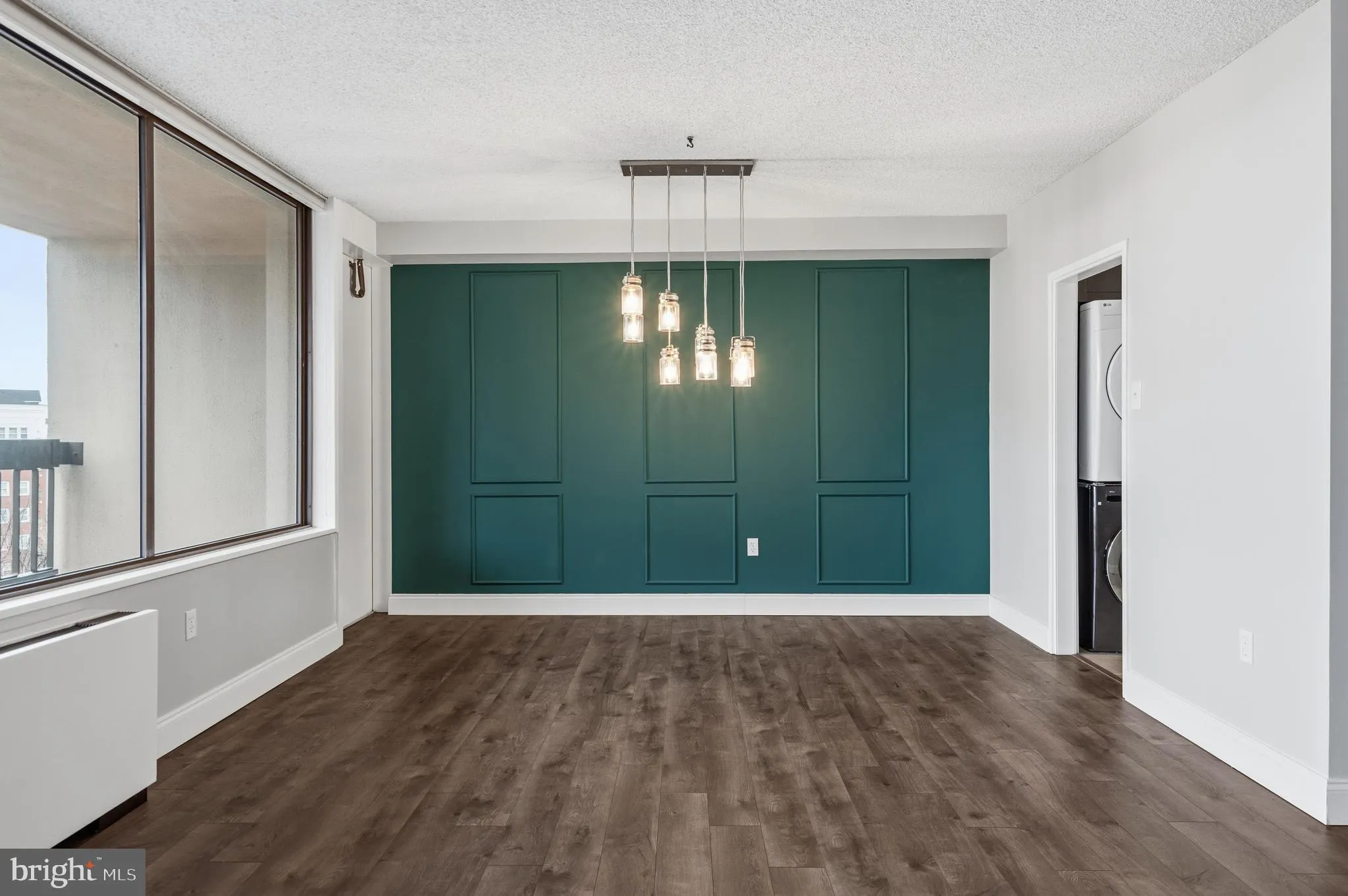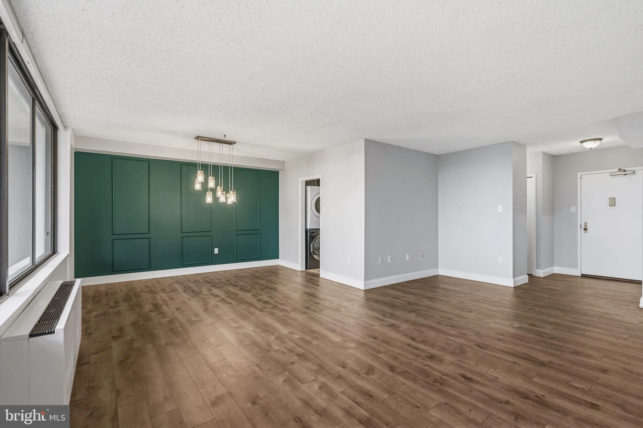 This light-filled home features an open layout ideal for everyday living and entertaining, highlighted by a stunning accent wall in the dining area that adds a unique, stylish focal point. The kitchen offers ample cabinetry and workspace, while both bedrooms are generously sized, including a primary suite with a private bath.