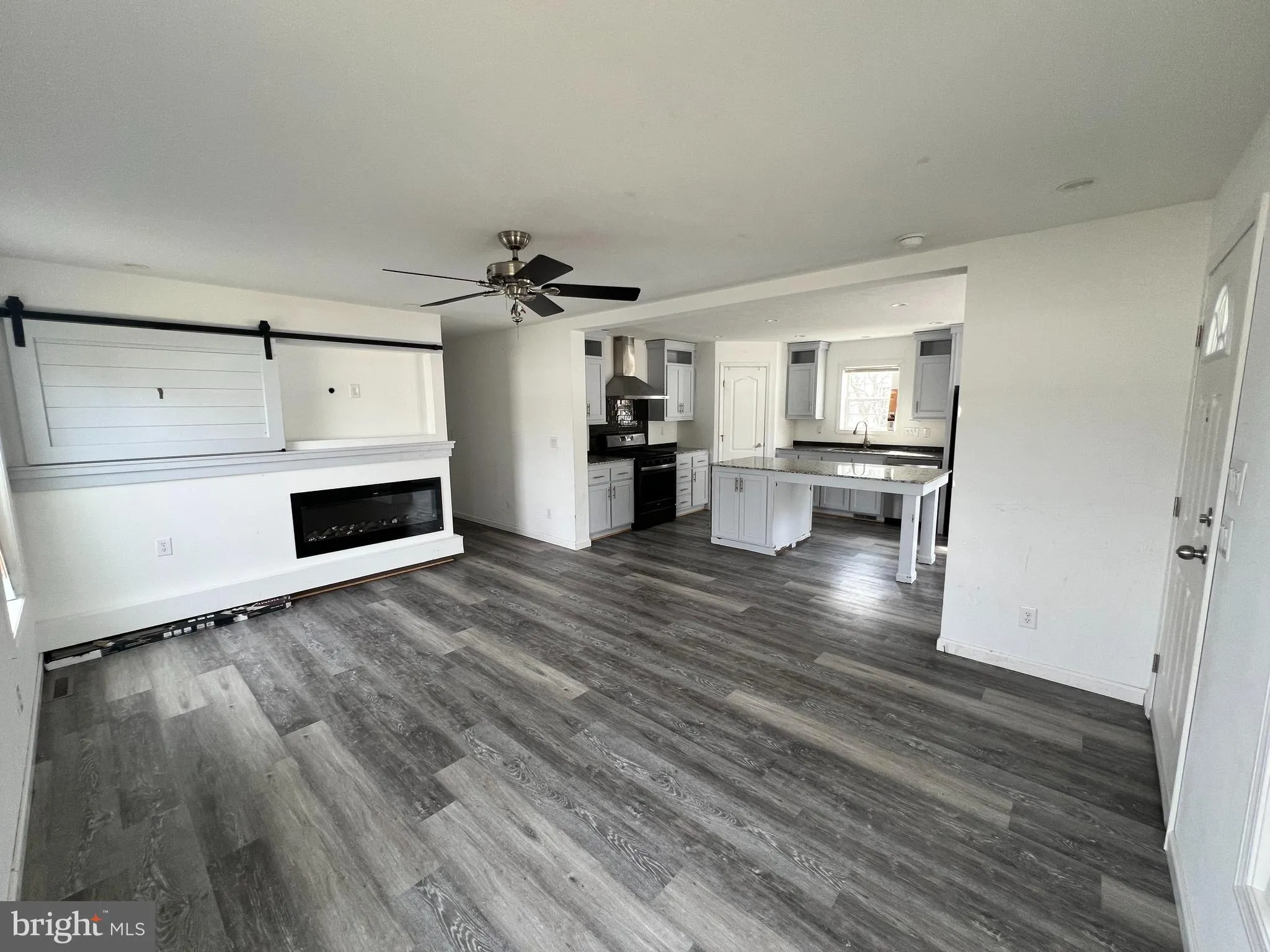 Step inside and you’ll immediately notice the quality throughout, starting with **real drywall** (not drywall panels) giving every room a solid, finished feel. The open-concept kitchen is a true showstopper, anchored by a **huge island with seating** — ideal for entertaining or casual family meals. The built-in entertainment center with sliding **barn door** adds stylish character to the living area, while the **electric fireplace** creates a cozy ambiance year-round.