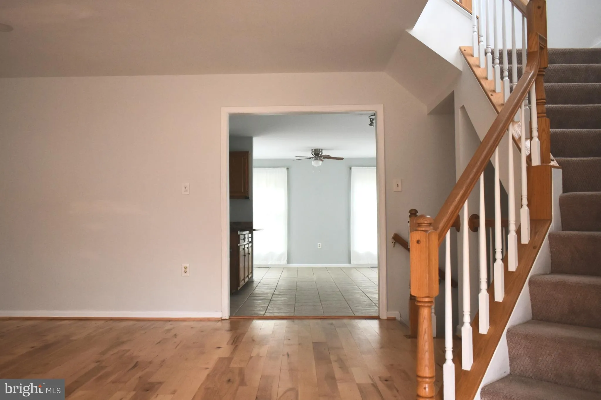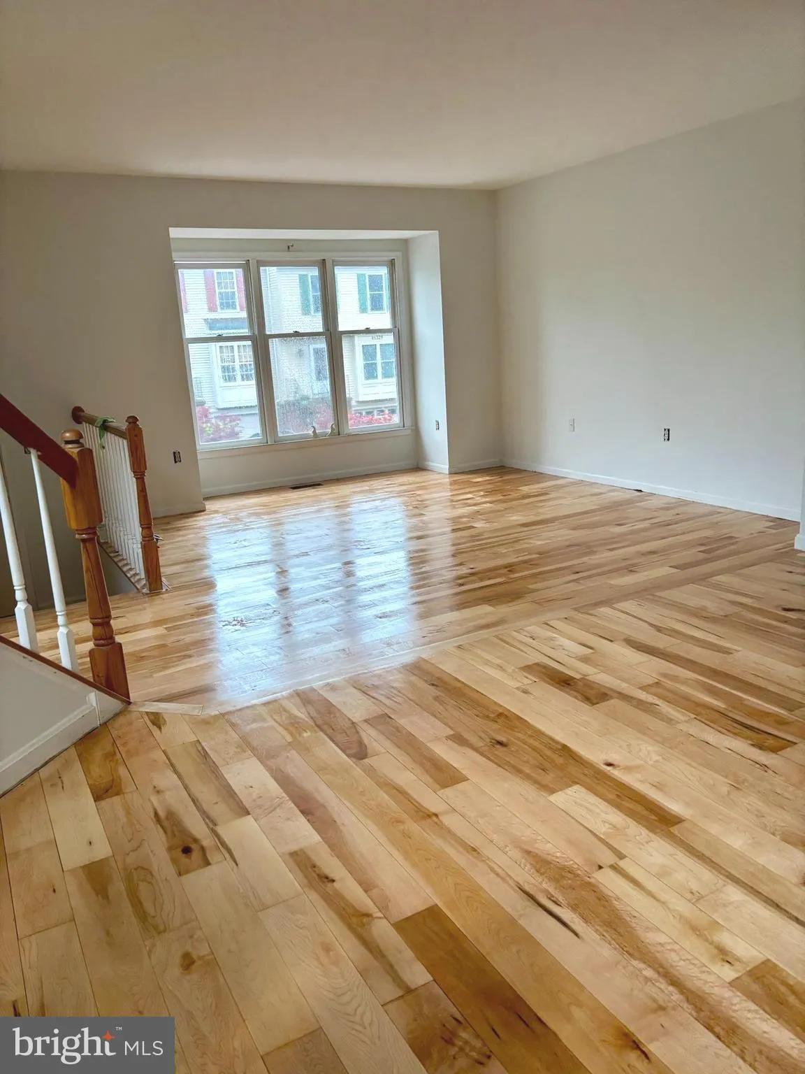 A bump-out extension on all three levels provides additional living space throughout the home, including an expansive primary suite (approx. 26′ x 13′), an extended kitchen area, and a larger family room. The main level features gleaming hardwood floors in the living and dining rooms, creating a warm and inviting atmosphere. The kitchen offers ample cabinet storage and great space for everyday cooking and hosting.