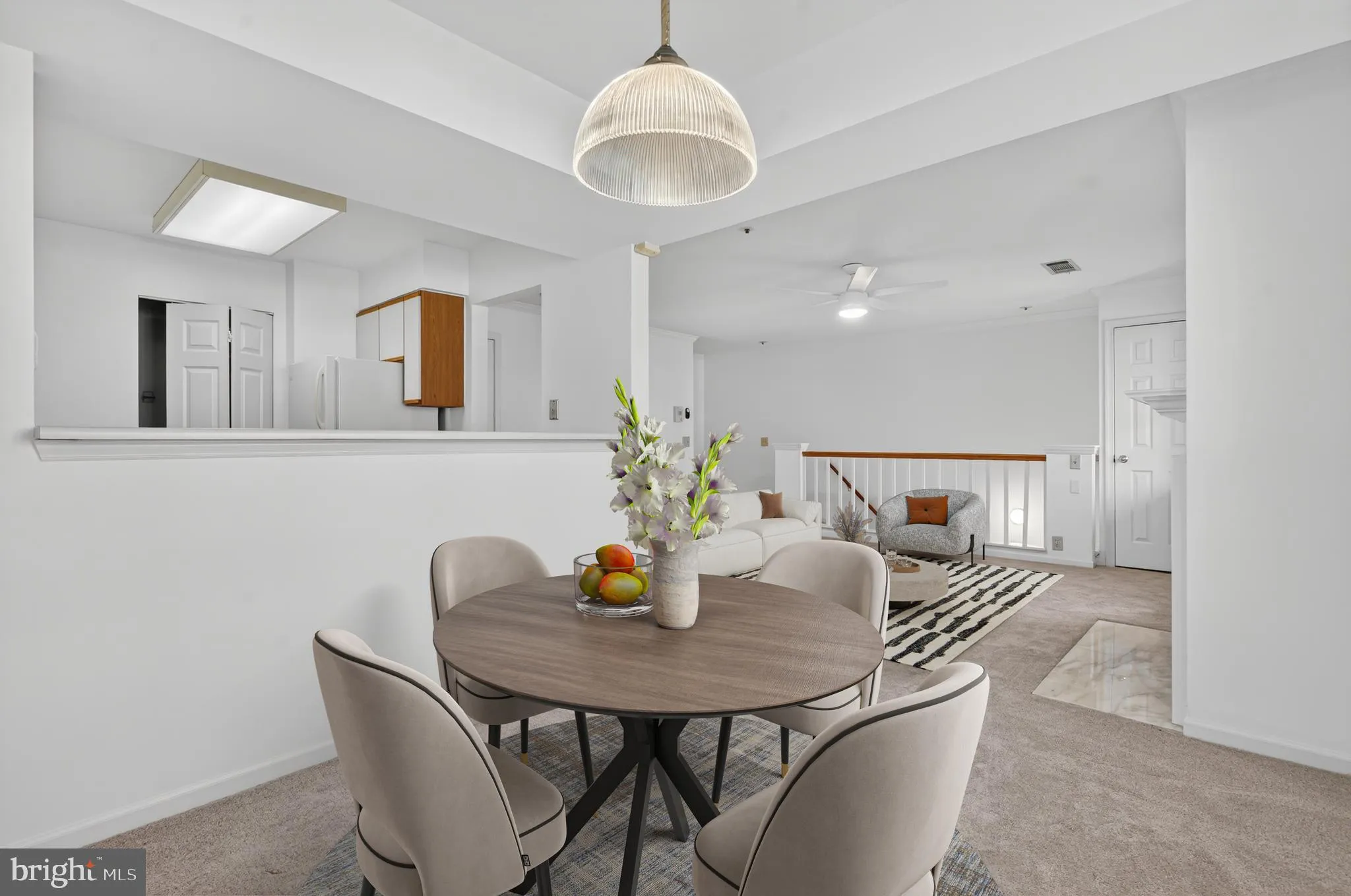 Bright and inviting two-level 2BR, 2.5BA condo with an open, airy floor plan in a fantastic location. Main level features comfortable carpeting, elegant crown molding, a spacious dining area, wood-burning fireplace, convenient half bath, and ceiling fan. The kitchen offers electric cooking, built-in microwave, icemaker, and a stackable washer/dryer tucked neatly in a storage closet/pantry.