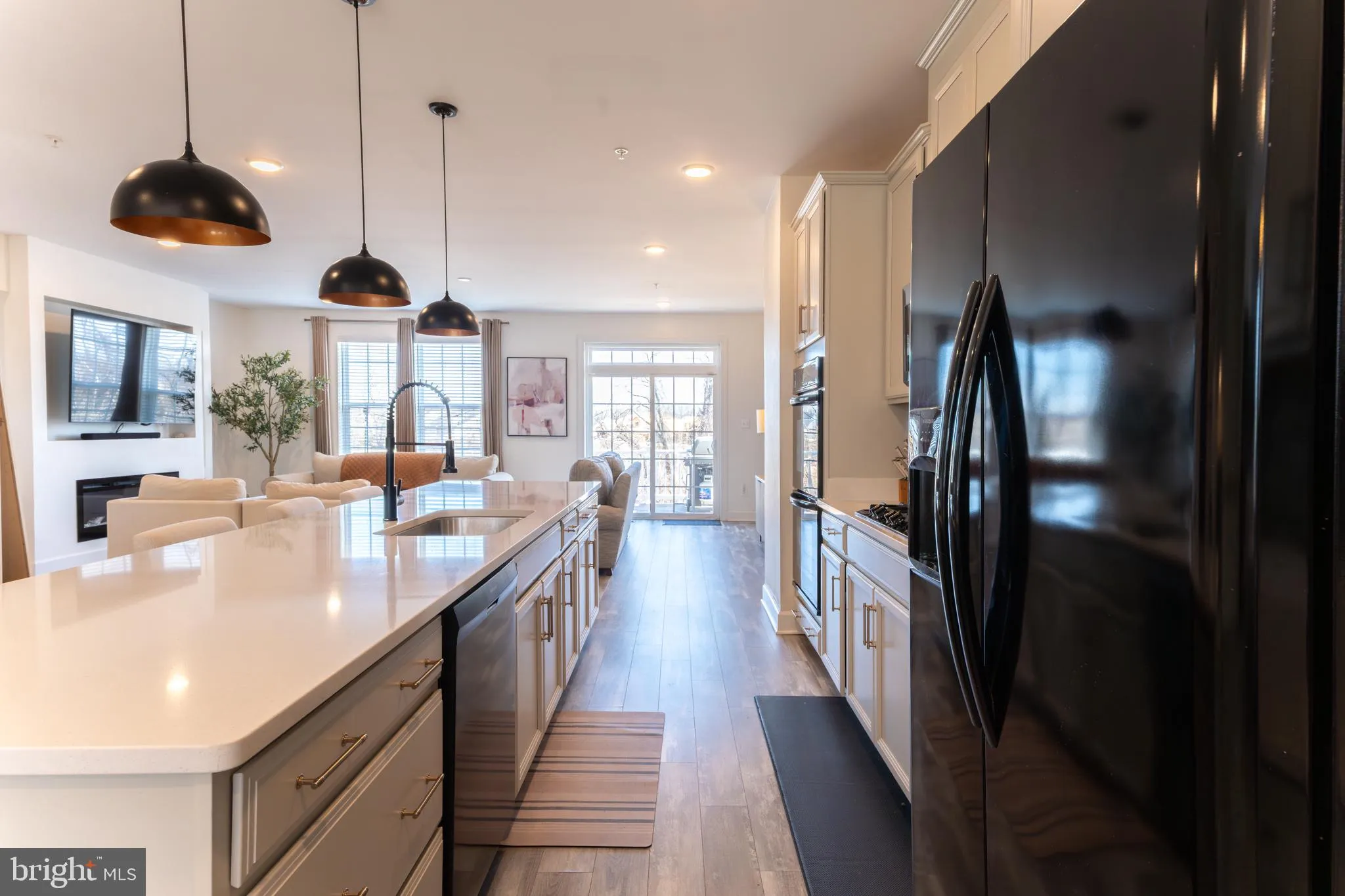 The main level features a bright, open layout that flows seamlessly from the living area into the kitchen, making it ideal for both everyday living and entertaining. The kitchen is the centerpiece, complete with an oversized quartz island, stylish backsplash, and plenty of room to gather.