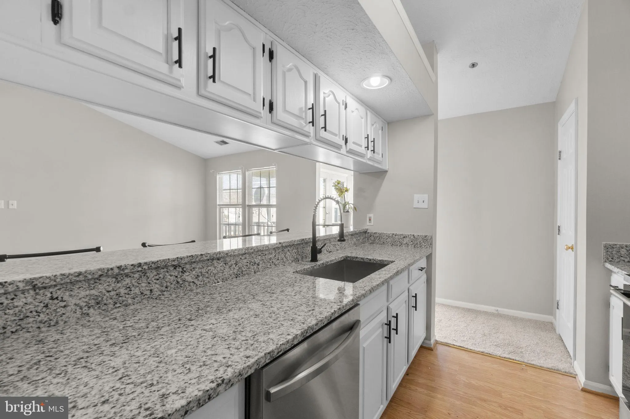 The kitchen has been tastefully refreshed to blend style and function; featuring newly painted cabinetry with updated hardware, sleek granite countertops, a modern adjustable faucet, and stainless steel appliances, including a newly added built-in microwave. The breakfast bar seamlessly connects to the dining and living areas, making everyday living and entertaining effortless.