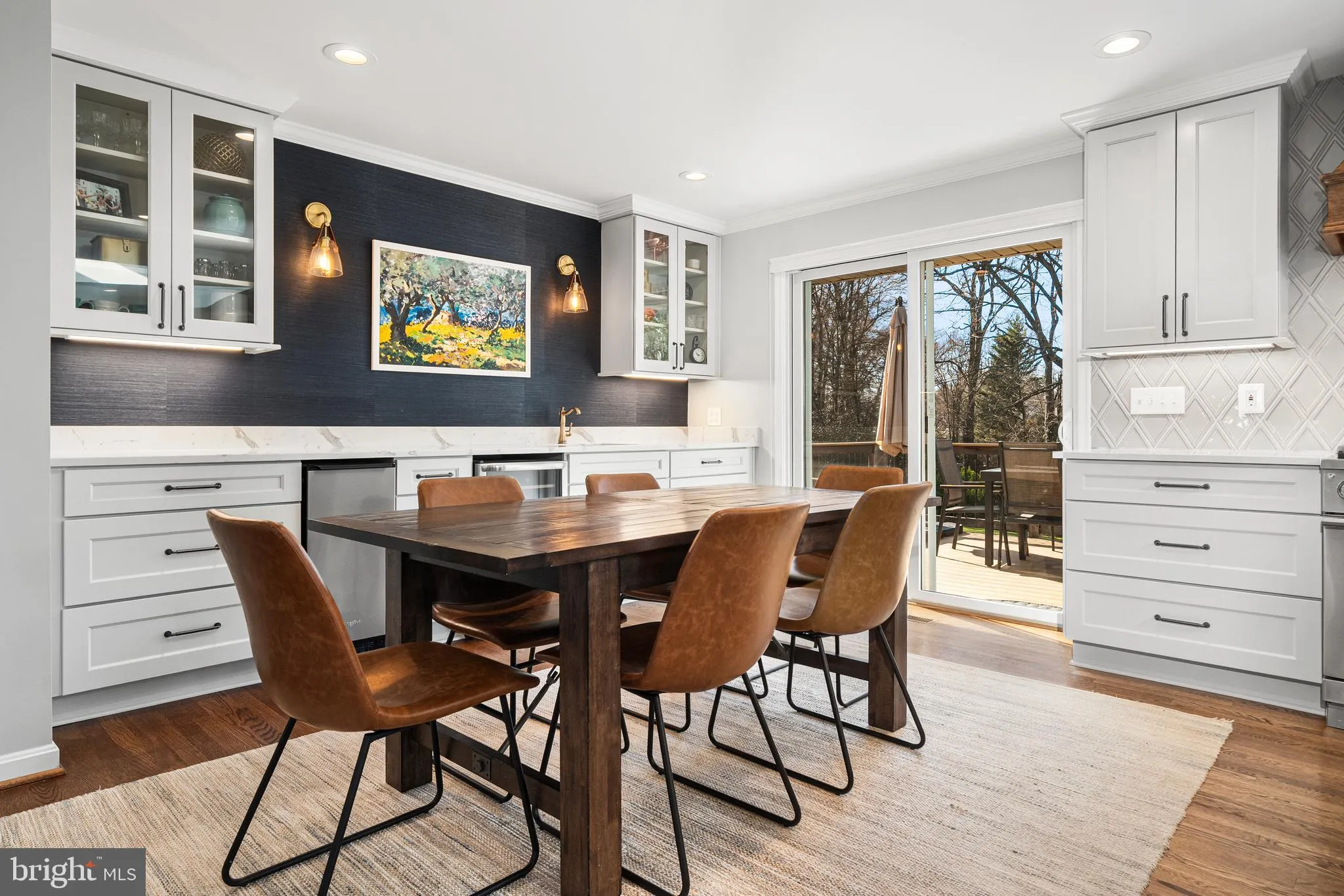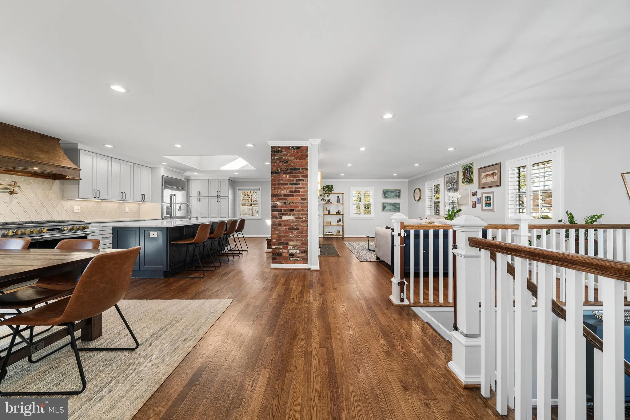 The sellers worked closely with Deluna Designs and Reico Kitchens to design an eat-in kitchen that blends warmth and character with modern functionality. GE Monogram appliances including a 48 inch gas range and 42 inch refrigerator. A custom wood hood, 10 foot island, pot filler, 2 sinks, beverage fridge and separate ice maker are a few additional highlights. An original exposed brick wall, dramatic skylight, and a cozy wood-burning fireplace create a space that feels both elevated and welcoming. The entire main level showcases hardwood floors, recessed lighting, while the dining room opens to a sliding glass door to the Trex deck, seamlessly connecting indoor living with the backyard oasis beyond.
