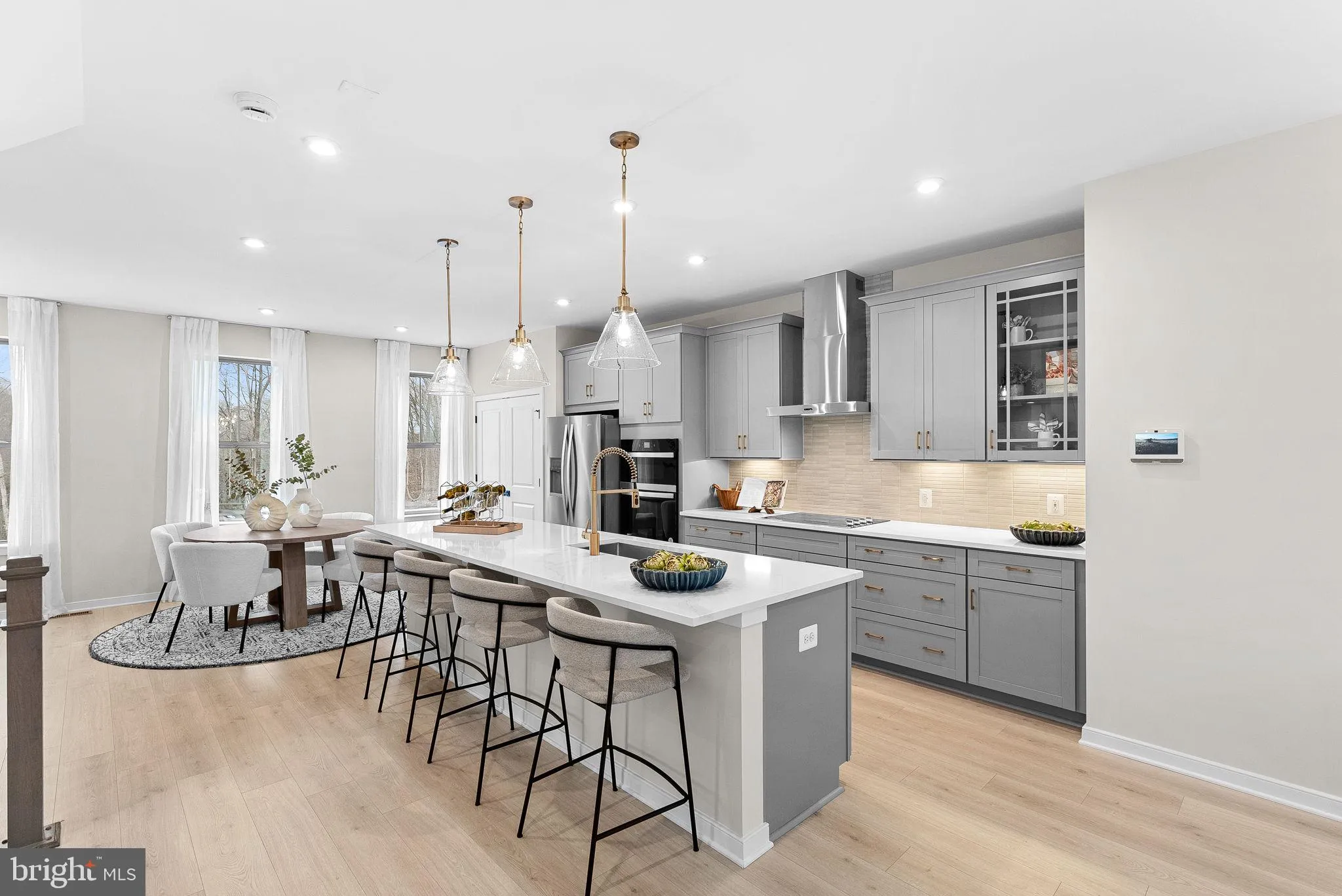inspired kitchens feature shaker cabinets, globe pendant lighting, quartz countertops, a