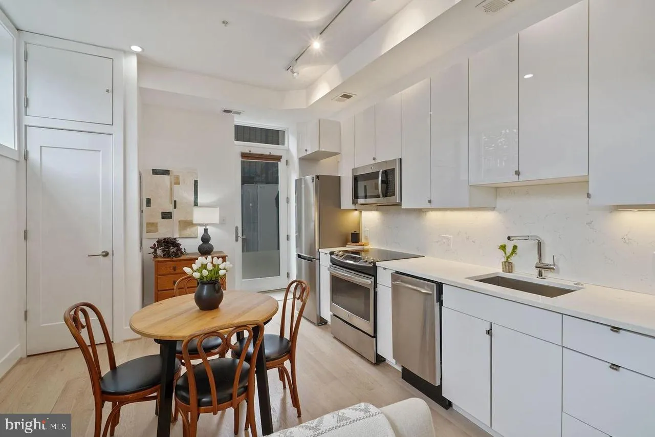 This stunning, modern 1-bedroom, 1-bathroom condo offers a private exterior entrance and a coveted off-street parking space. Built in 2015, the unit features gleaming hardwood floors and is bathed in natural sunlight from large windows. The smart, spacious floor plan provides defined areas for both living and dining, while the sleek kitchen showcases high-gloss European-style lacquer cabinets, quartz countertops, and stainless-steel appliances. The cozy bedroom includes a walk-in closet, and the convenience of an in-unit stacked washer and dryer adds to the home’s appeal. Residents can enjoy the building’s incredible shared rooftop space, offering breathtaking views of the Capitol and monuments.