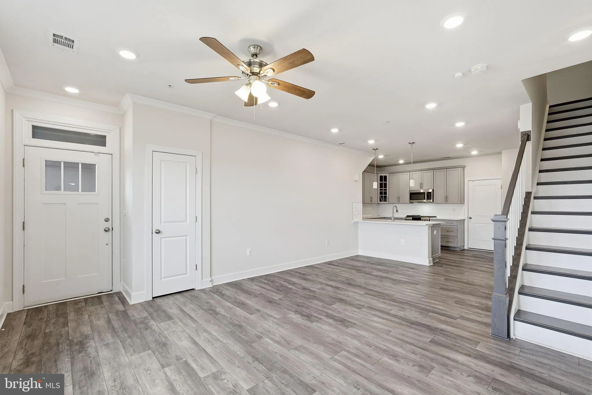 The light-filled main level features luxury vinyl plank flooring, recessed lighting, and an open layout. The gourmet kitchen includes upgraded cabinetry, quartz countertops, stylish backsplash, pendant lighting, and stainless steel appliances.