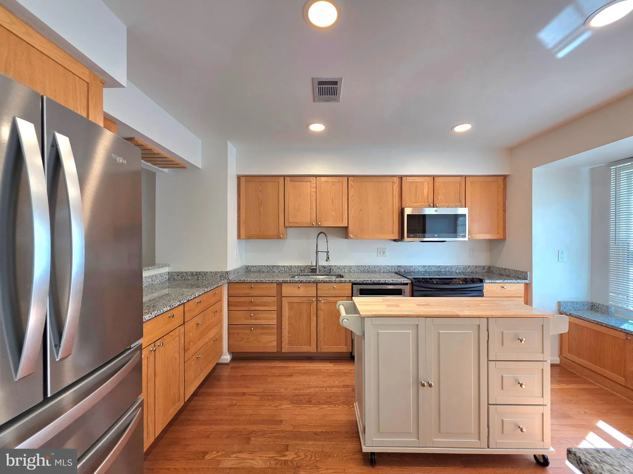 The main level features an updated kitchen with granite countertops, shaker cabinets with stainless hardware, recessed lighting, and a passthrough window to the open-...