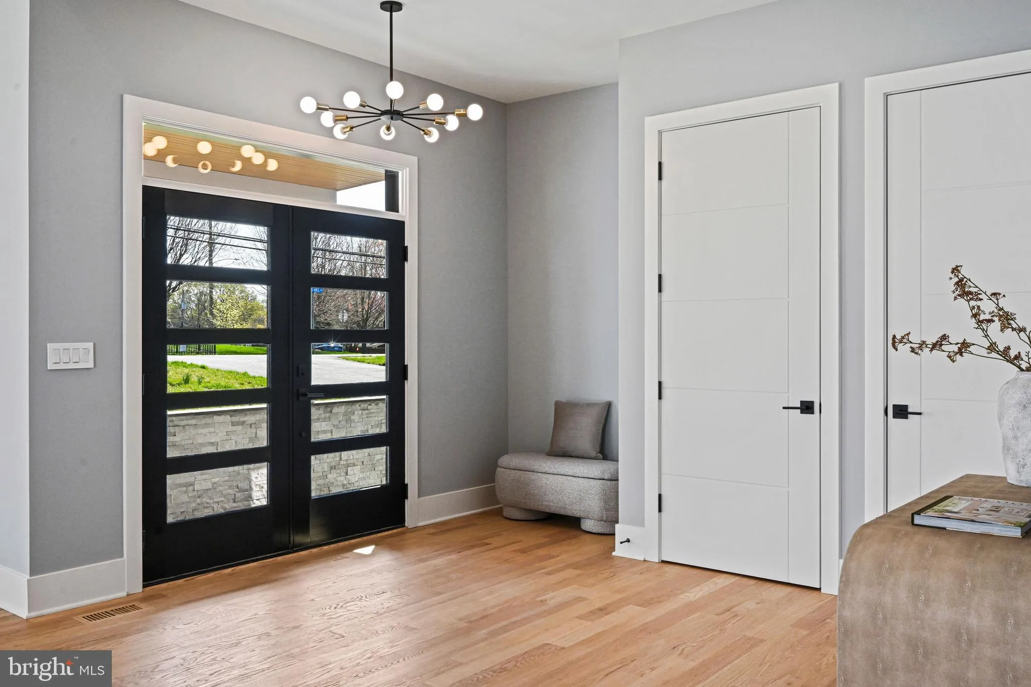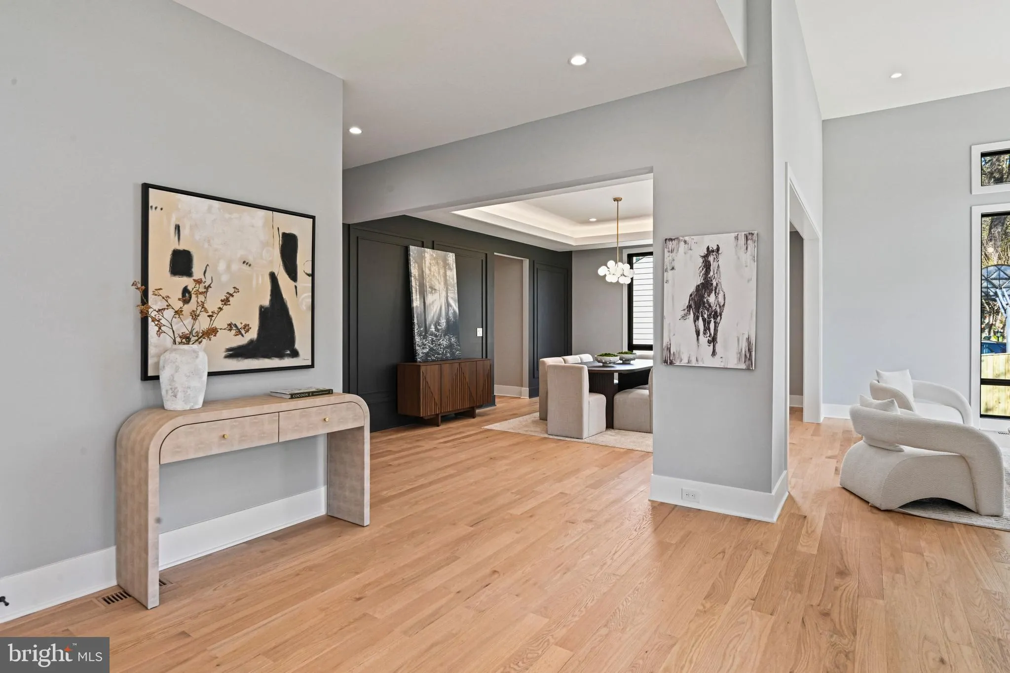 Inside, you’re greeted by soaring 10-foot ceilings, wide-plank hardwood floors, and a striking floating staircase. The main level features an open, light-filled living room that flows effortlessly into the dining area, ideal for both everyday living and entertaining. The chefs kitchen is a true centerpiece, complete with custom cabinetry, soft-close drawers, a waterfall quartz island, Sub-Zero and Wolf appliances, and a separate prep kitchen with an oversized pantry. A secondary main-level suite offers a full bath, walk-in closet, and bedroom, perfect for guests or multigenerational living. A gas fireplace anchors the family room, which opens to a rear deck, perfect for indoor-outdoor gatherings.
