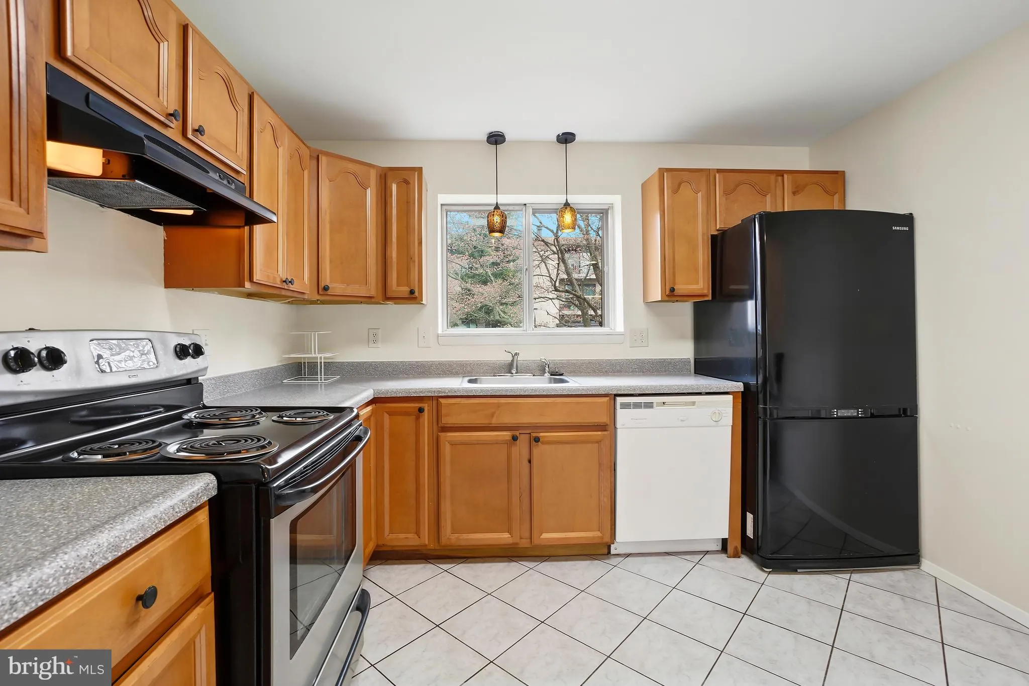 Step inside to a warm and inviting main level featuring rich wood flooring. The updated kitchen boasts warm-toned wood cabinetry, a stainless-steel stove, and a convenient peninsula with breakfast bar seating perfect for casual dining or entertaining. The kitchen flows seamlessly into the spacious dining area, which easily accommodates a large table, and opens to a bright living room with floor-to-ceiling picture window that fills the space with natural light.
