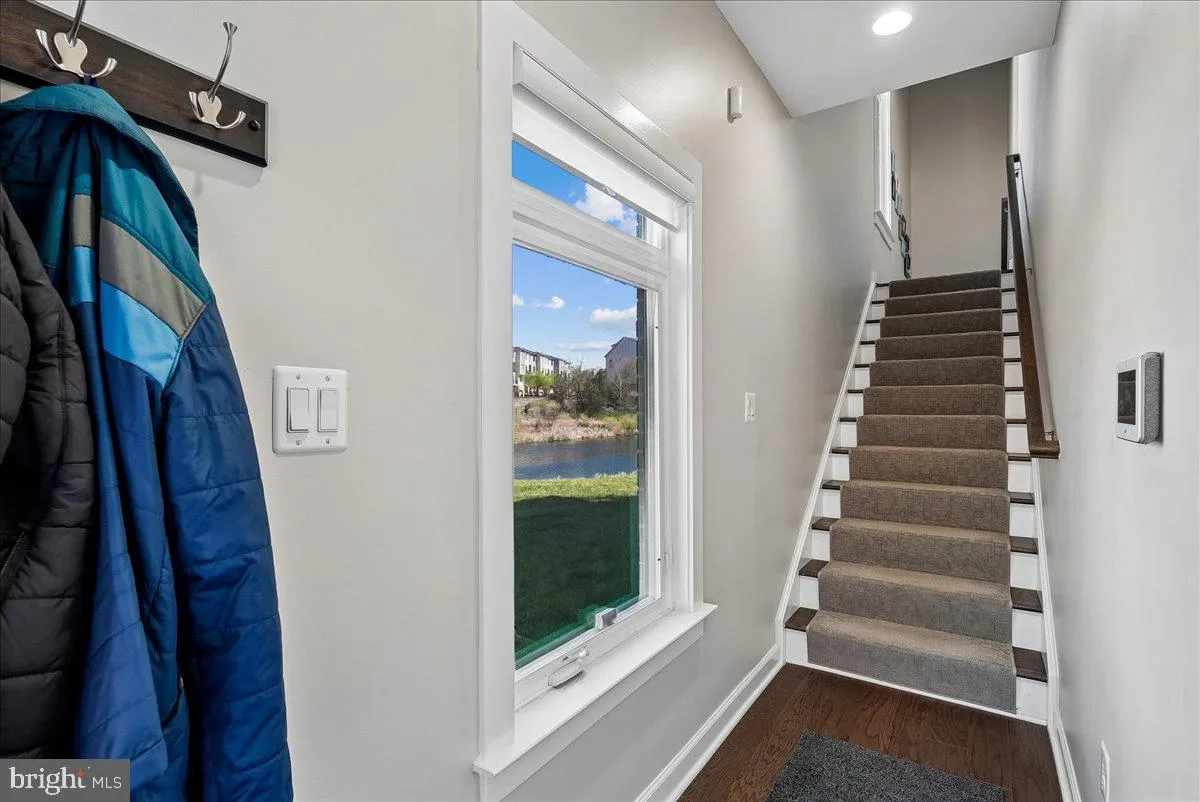 Fall in love with this distinctive four-level end-unit townhome on a premium lot backing to mature trees and a beautiful pond overlooking the Village at Leesburg. With nearly 4,000 finished square feet of luxurious living space, this townhome is actually larger than many single-family homes. The modern open floor plan features a stunning chef’s kitchen with white cabinetry, upgraded quartz countertops, designer lighting, a dramatic center island, modern exhaust hood, and upgraded stainless steel appliances, including a five-burner gas cooktop. A newly added dry bar and beverage center features open shelving and a wine cooler and beverage dispenser. The oversized dining area has two double sliding doors that open to a covered outdoor porch with expansive views of the village, perfect for relaxing or entertaining. The family room showcases custom built-in shelving and a floor-to-ceiling tiled gas fireplace. The atmosphere is relaxing, the vibe is modern and chic.