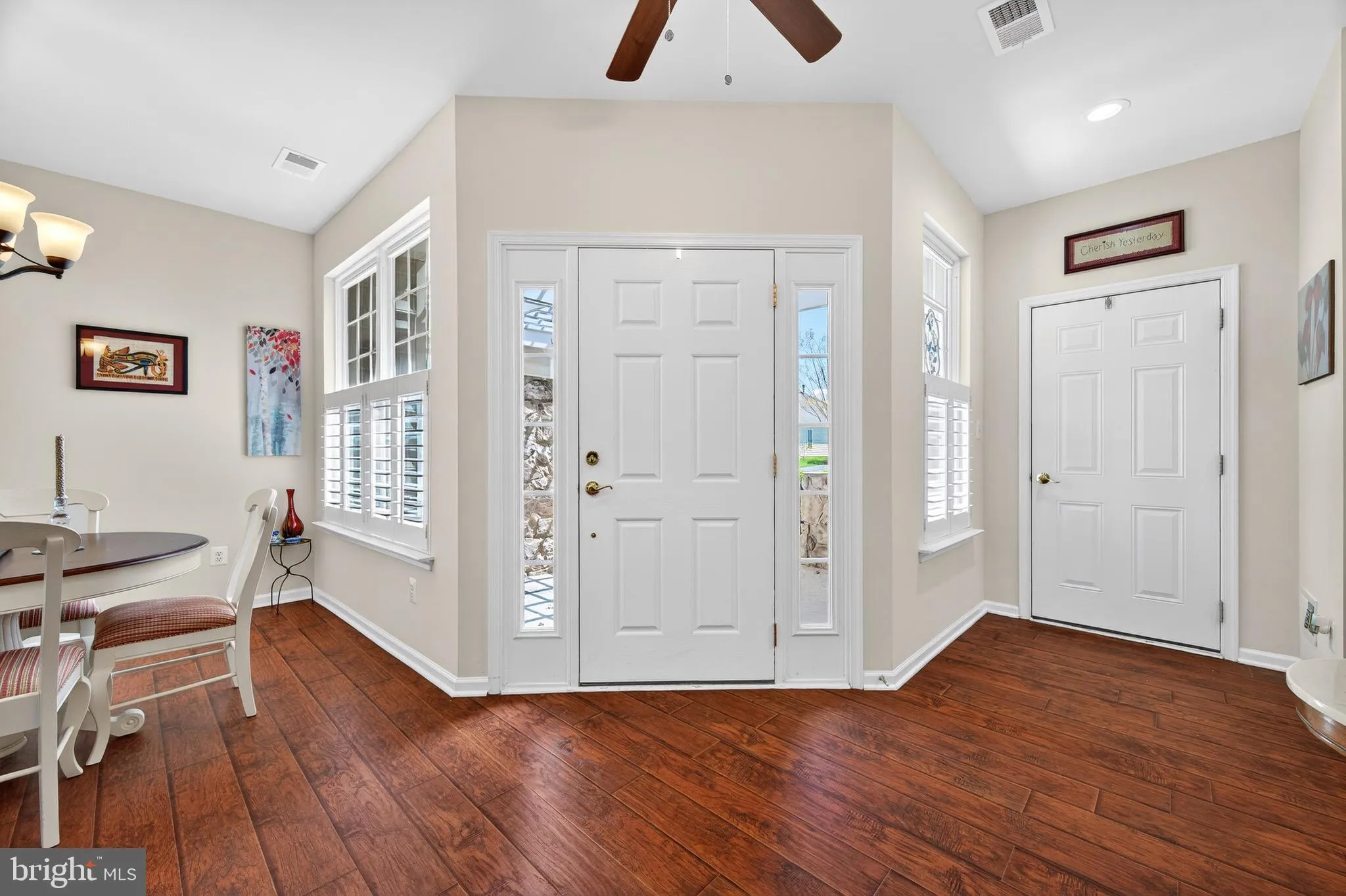 The main-level owner’s suite is a true retreat, complete with a ceiling fan, expansive walk-in closet, and a beautifully updated bath featuring a large vanity with dual sinks and a spa-inspired tile shower.