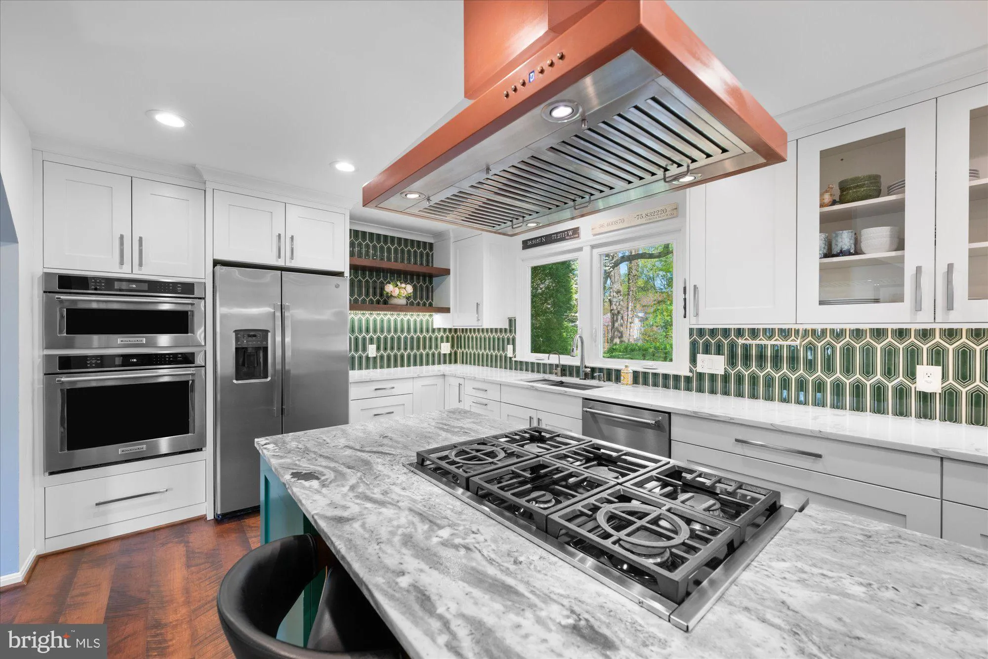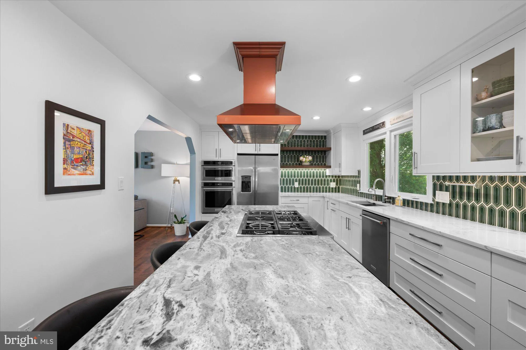 The main level offers an inviting layout with generous formal and informal living spaces, including a large living room, family room with fireplace, spacious dining area, powder room, and a dedicated laundry room. The beautifully renovated kitchen was completely reimagined in 2020 and serves as the heart of the home, featuring custom millwork cabinetry, Italian stone countertops, custom backsplash, KitchenAid and GE Profile appliances, a striking custom hood, and an oversized island with seating. The adjacent dining area was also enhanced with a dry bar and Zephyr wine cooler, creating an ideal setting for entertaining. French doors lead to an expansive rear deck overlooking the large, private backyard.