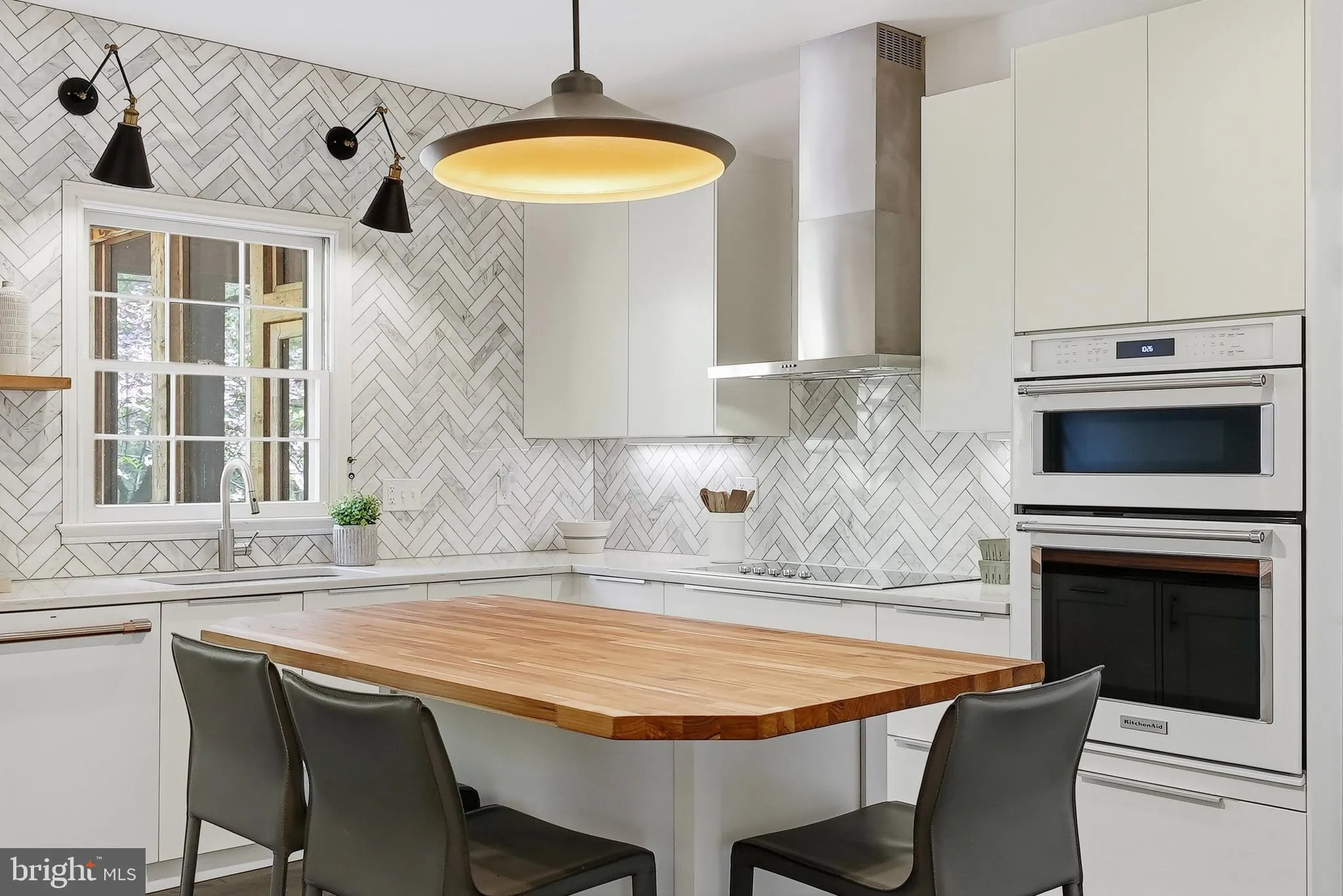 The kitchen has been thoughtfully updated with clean, modern finishes, featuring upgraded countertops, stainless steel appliances, and a generous butcher block island with bar seating that naturally serves as the heart of the home. A striking marble backsplash in a chevron pattern extends across the walls, adding a distinctive layer of design and texture. A separate access leads to the rear deck, where serene wooded views provide a beautiful backdrop for both daily living and outdoor dining.