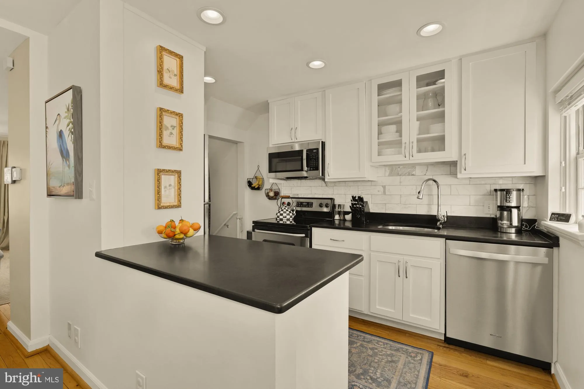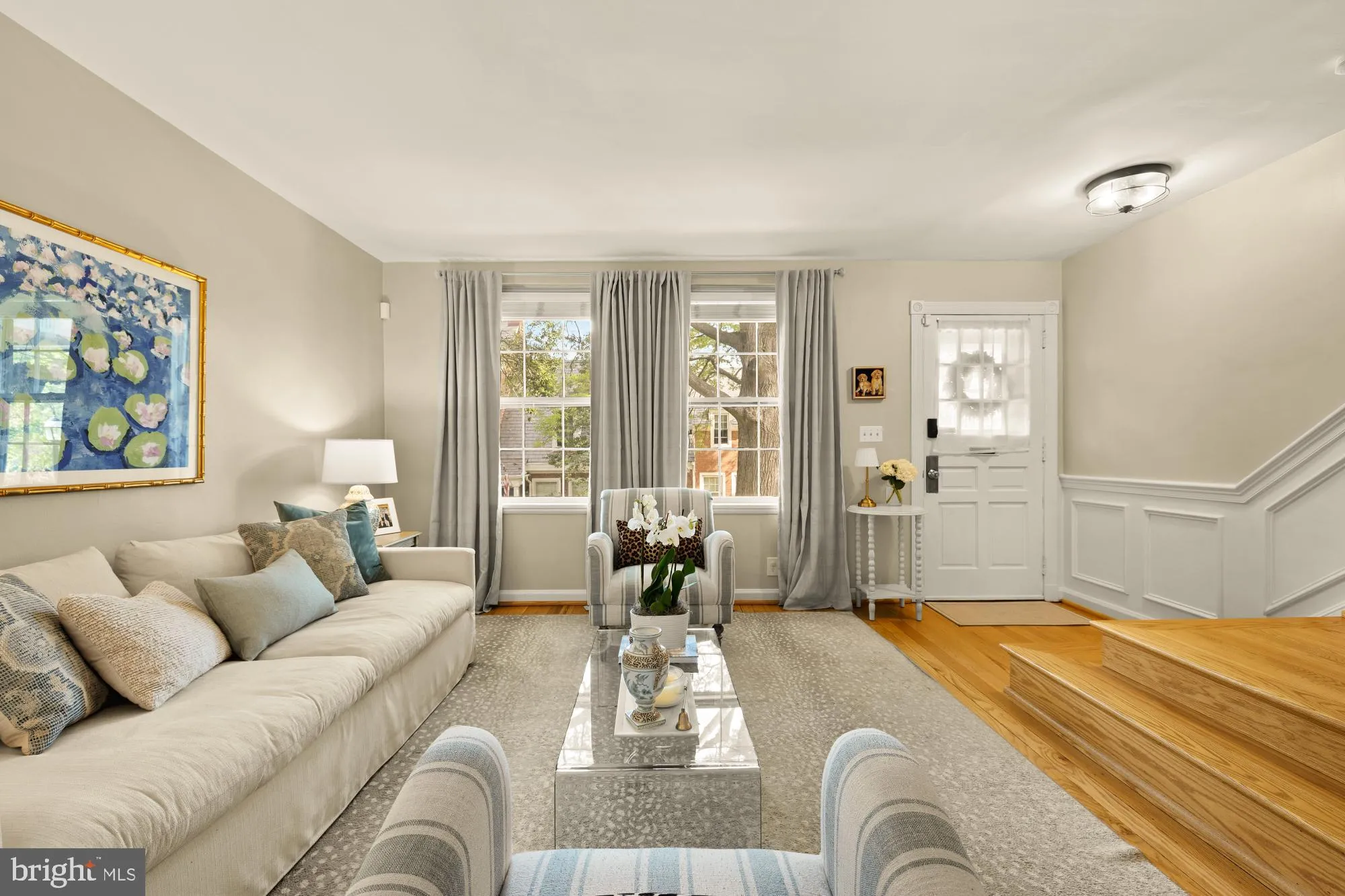 The sun-drenched main level offers an expanded, open living space created by the removal of the traditional Fairlington front closet, enhancing both flow and functionality. Thoughtful details include elegant wainscoting along the staircase, hardwood flooring, smooth ceilings, and fresh paint throughout.