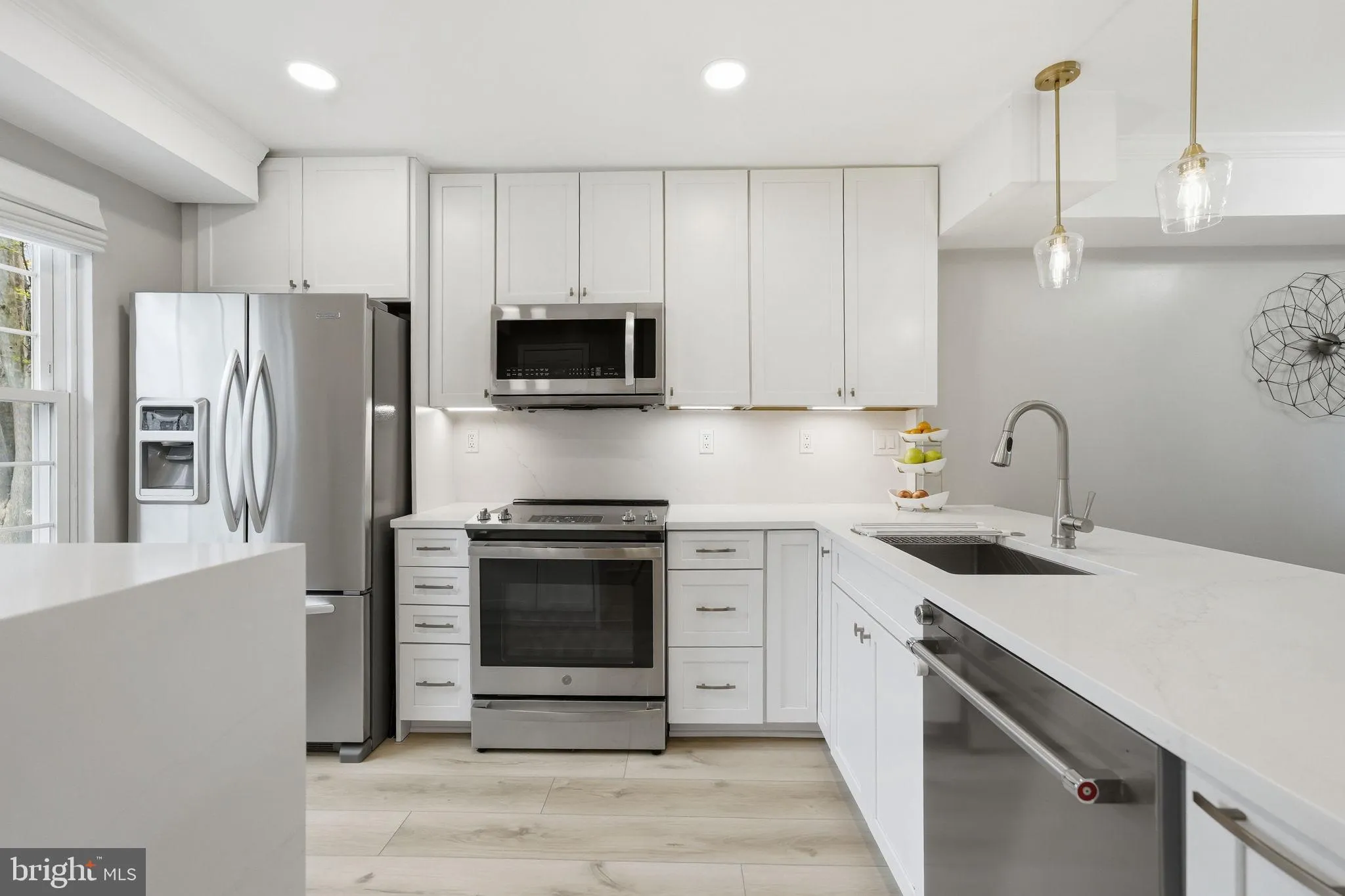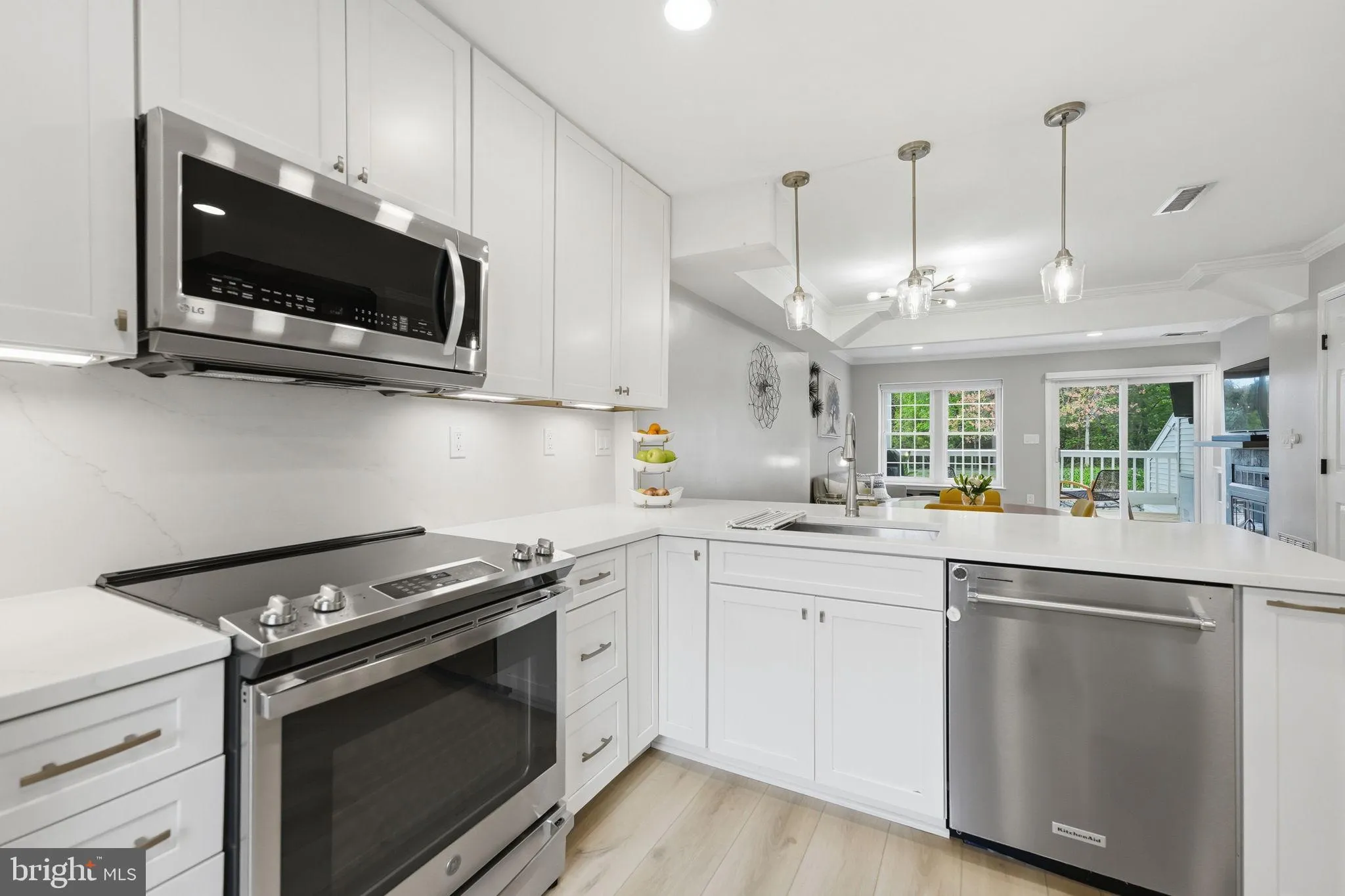 From the moment you step inside, you’re greeted by beautiful wood-inspired flooring, designer lighting, and an inviting, open-concept layout. The gourmet kitchen is a true showpiece, featuring striking Calacatta quartz countertops with a waterfall edge, white shaker cabinetry, and stainless steel appliances-all seamlessly flowing into the elegant dining and living spaces, creating the perfect setting for both everyday living and sophisticated entertaining.
