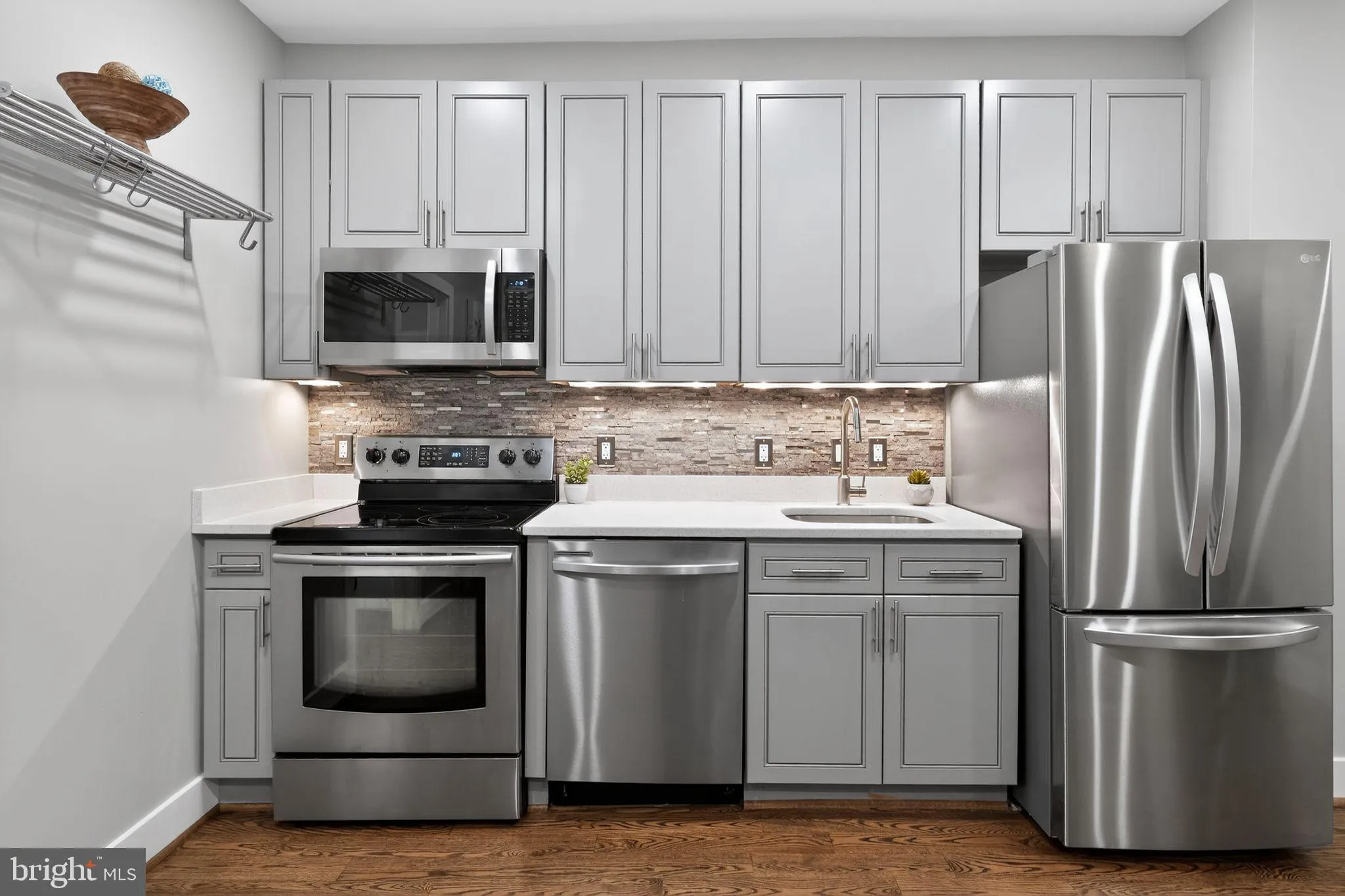 Fully renovated in 2016, this home features an open-concept layout with rich hardwood floors throughout, creating a seamless flow for both everyday living and entertaining. The kitchen is equipped with quartz countertops, stainless steel appliances, and contemporary finishes.