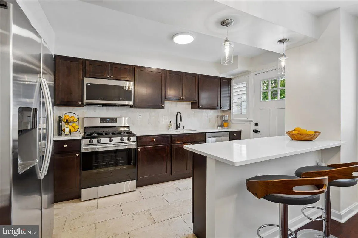 Step inside to refinished hardwood floors, fresh paint, updated baths, and stylish modern hardware. The main level flows effortlessly from a bright living room to a dedicated dining area and into a sleek, fully equipped kitchen. Here you’ll find brand‑new quartz countertops, stainless steel appliances, a new backsplash, pendant lighting, bar seating, and a convenient powder room. From the kitchen, walk straight out to the rear patio; perfect for grilling, hanging out, or unwinding after a day in the city.