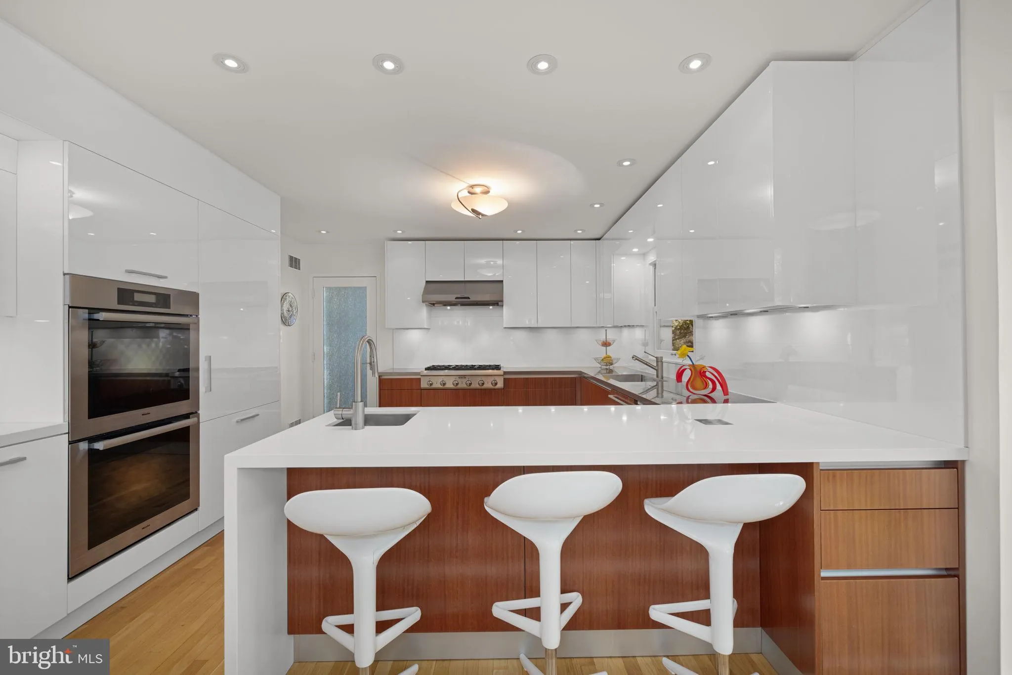 The main level offers a large sun-filled Pedini-designed kitchen with Mondrian-style glass cabinets, stainless-steel counters, a Silestone White Zeus center island, under-cabinet lighting, integrated Miele appliances, and floor to ceiling Marvin picture and casement windows with retractable screens and motorized Hunter Douglas shades; a living room with a custom Fior di Pesco Carnico Italian marble surround and slab fireplace, two skylights, and an Artemide Droplet ceiling light; and a dining room with a massive Marvin picture window and Marvin casement windows with retractable screens overlooking the private landscaped garden. Twelve spotlights illuminate artwork in the living and dining rooms. There are hardwood floors throughout this level, including in the kitchen, as well as a large copper sunk-in space that is perfect for displaying plants, illuminated by a Solatube.