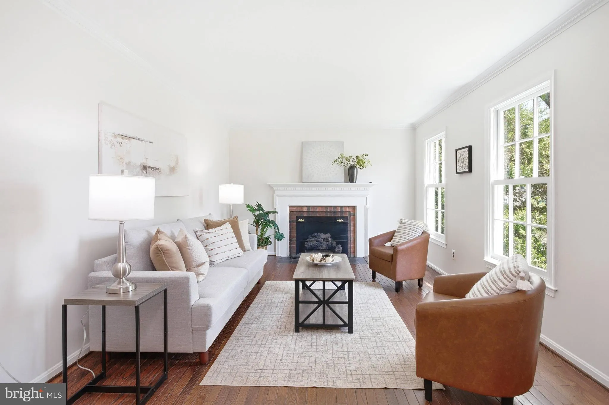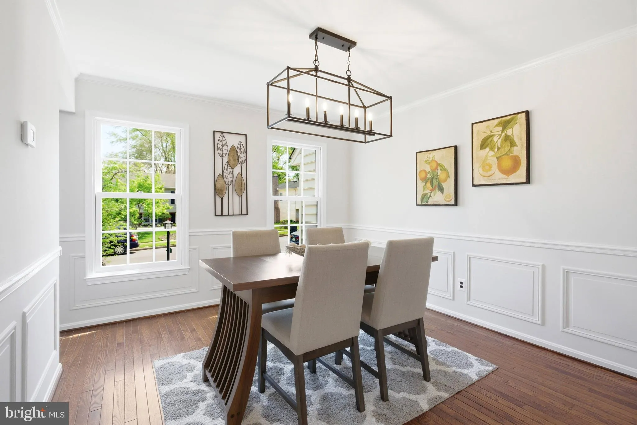 Inside, gleaming hardwood floors flow throughout the main level, where a traditional layout creates comfortable, well-defined living spaces. The formal living room is warm and welcoming with a cozy gas fireplace, while the dining room shines with an updated chandelier—perfect for hosting gatherings both large and small. The kitchen features refaced cabinetry, a designer tile backsplash, and stainless steel appliances, opening seamlessly to a brick patio that overlooks the beautifully landscaped yard—an ideal setting for outdoor dining and relaxation.