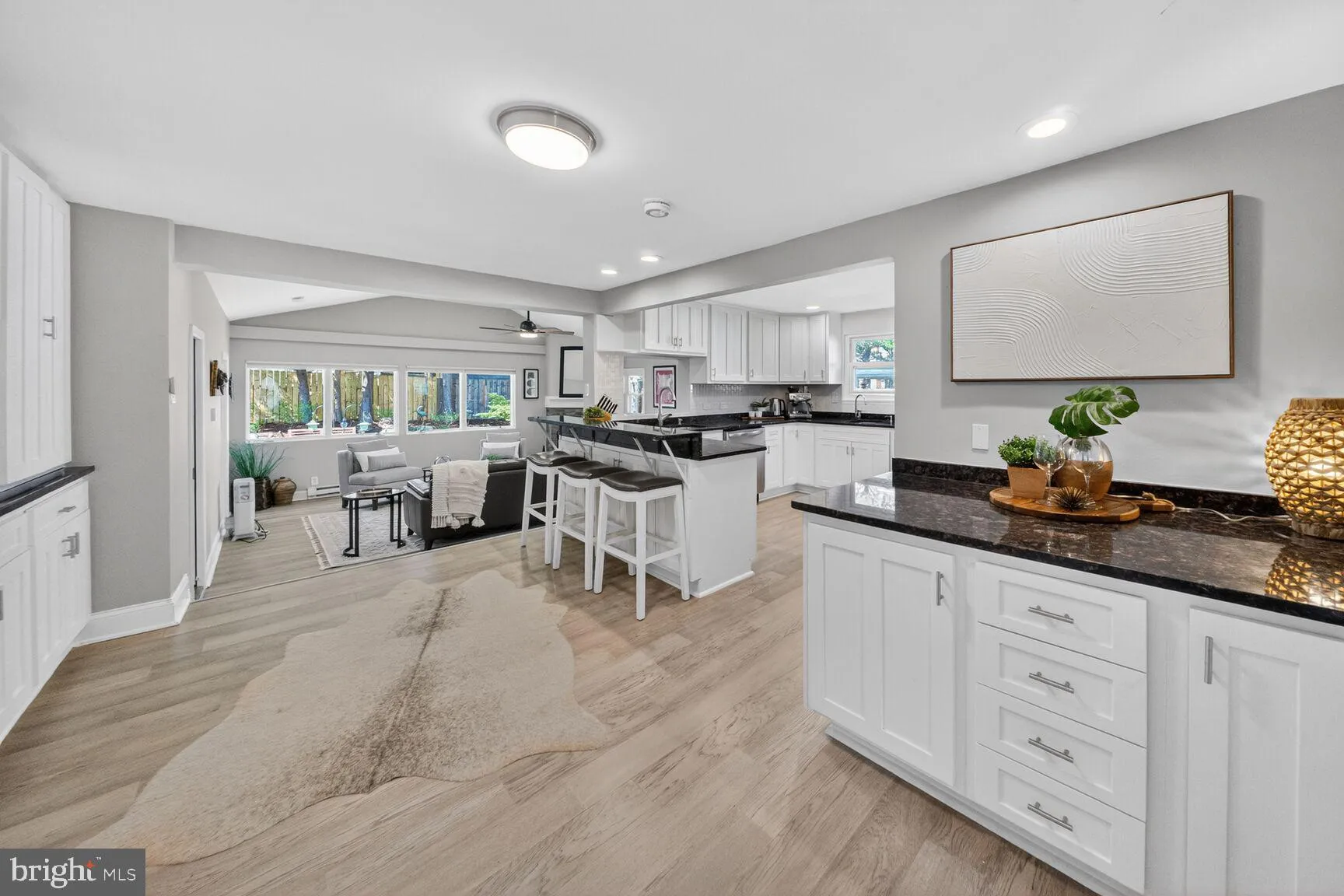 Inside, the home is bright, clean, and thoughtfully designed. A fully renovated kitchen anchors the main level, two distinct living areas that balance elegance with everyday functionality and are ideal for entertaining as well as flexible work-from-home living. Expansive windows bring in natural light throughout.