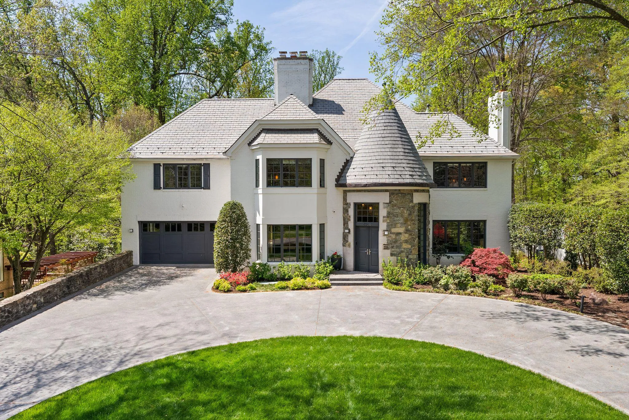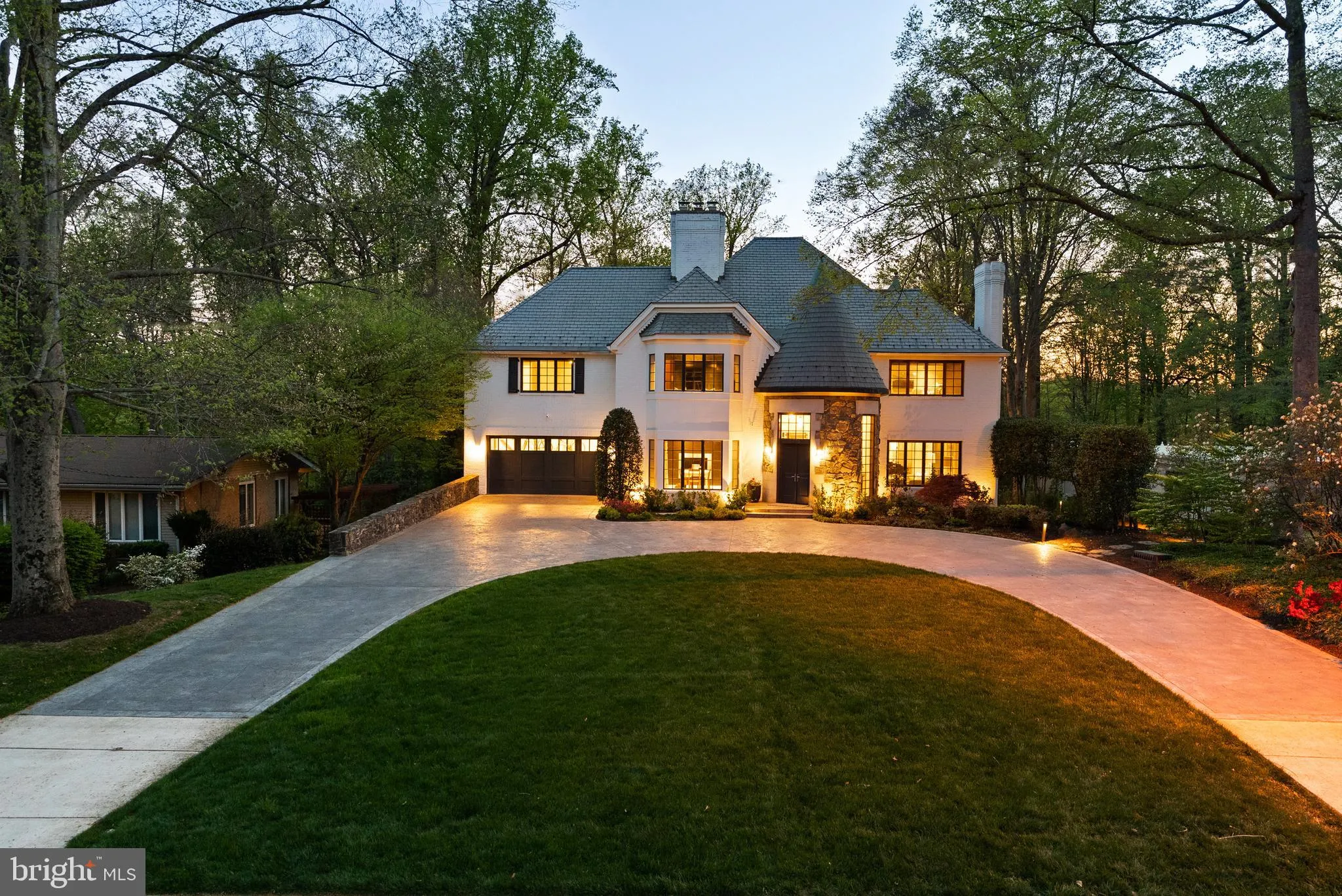 Welcome to a truly exceptional, fully reimagined estate set on a private half-acre in the heart of Bannockburn Estates. Spanning over 7,300 square feet across four impeccably designed levels, this rare offering is a seamless expression of architectural presence, elevated design, and resort-caliber living. A painted brick exterior, slate roof, and two striking turrets establish a sense of timeless distinction—an arrival that feels both grand and enduring.