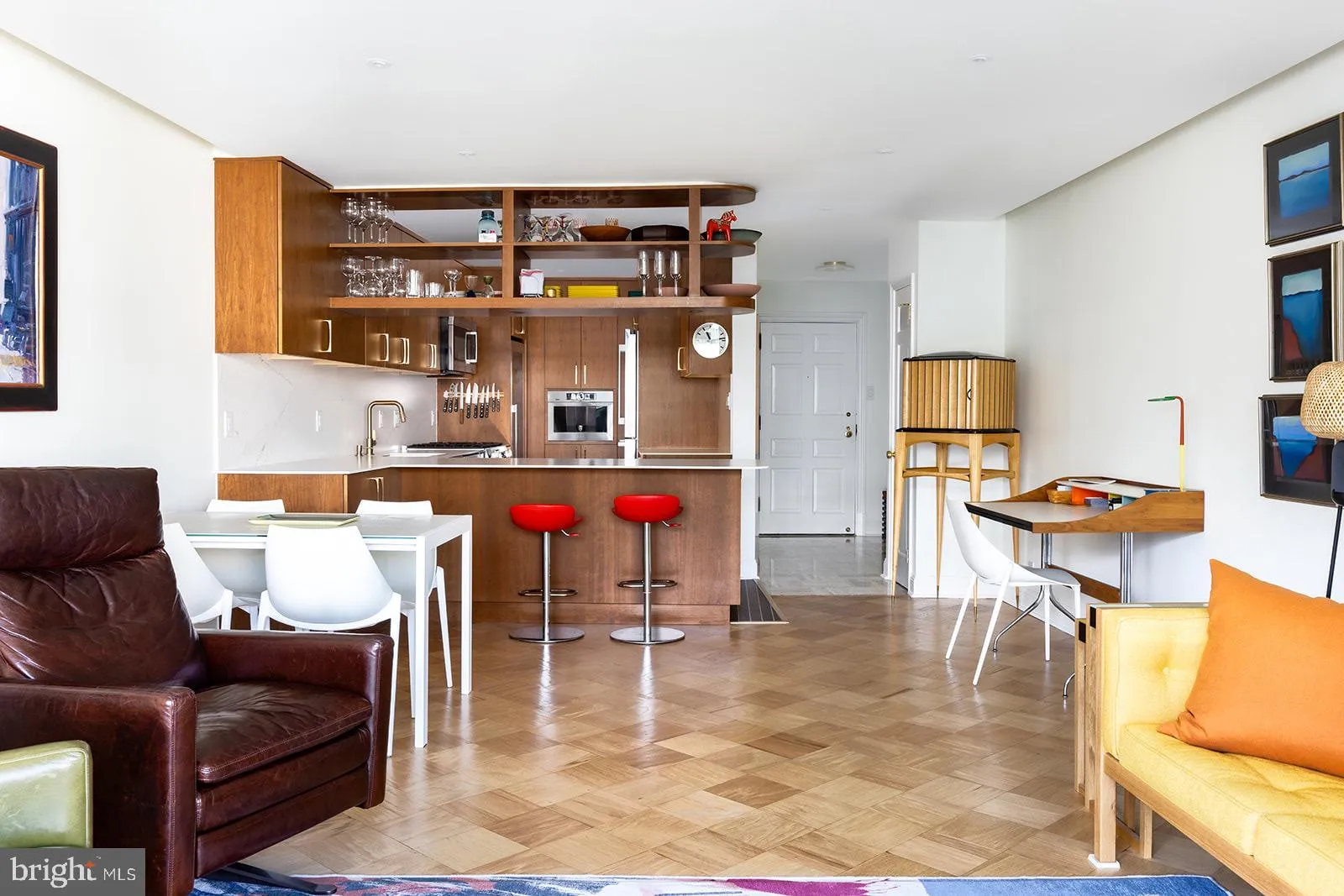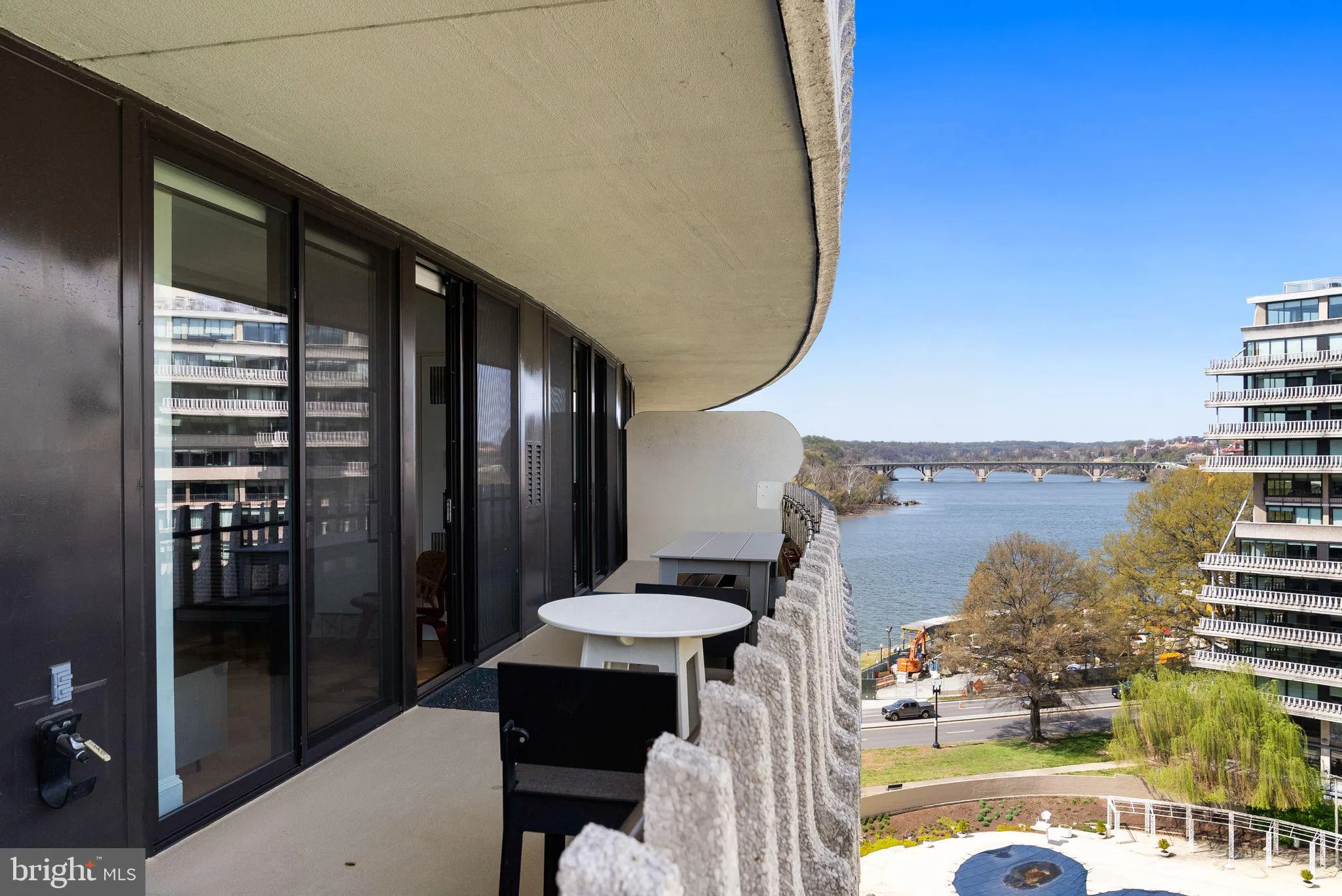 Step into a stylish and sophisticated interior, designed by renowned BOWA builders! The finishes and design are reminiscent of a luxurious yacht – highlighted by beautiful Italian “boat” flooring in the gourmet kitchen and spa baths. New floor-to-ceiling windows and the freshly painted long balcony extend across the perimeter offering a river view vista. The floor-to-ceiling windows have a double opening that brings the outside in. The superb open kitchen features floating wood shelves with under-mount lighting, a breakfast bar, stunning Silestone counters and backsplash, custom lighting, Kohler brass hardware, and stunning cabinetry. All new appliances include a Bosch range, wine cabinet by Wine Enthusiast, and built in gourmet coffee maker. The spacious primary bedroom has a huge custom walk-in closet plus additional storage and closet space. The primary bath allows you to sail away in luxury, featuring a custom wood vanity with plentiful storage and double sinks, a shower with a teak bench, Toto Washlet and stunning tile surrounding the sinks and shower. Both baths feature Deklin countertops, Kohler lighted vanities, Kohler medicine cabinets, Kohler brass hardware, and spa showers with both rain shower and handheld fixtures. The second bath features a handsome wood vanity as well and an outstanding tile surround. The second bedroom is completely versatile – a state-of-the-art hidden bed system with desk and shelving turns into a fold down bed with the ease of swivel action. The finish is light wood finish and even offers closet storage. This is the perfect home office by day, and bedroom by night. The desk drops down or folds in when not in use. The second bedroom also has a large walk-in custom closet. Both bedrooms offer custom shades. Recessed and cove dimmable lighting. Italian marble entry. Storage room included. One underground garage space included. Fee includes property taxes, utilities, maintenance of HVAC, basic cable, internet, and parking. Watergate South amenities include 24-hour front desk & doorman service, outdoor saltwater pool & grill, newly renovated fitness center, rentable suite for guests, newly renovated community room, beautifully landscaped gardens, roof terrace, dog spa room, plus on-site shops & restaurants. Walk to Foggy Bottom Metro, Kennedy Center, Whole Foods, and Georgetown Waterfront. High walk score near shopping, restaurants, Watergate Hotel, and many more conveniences.