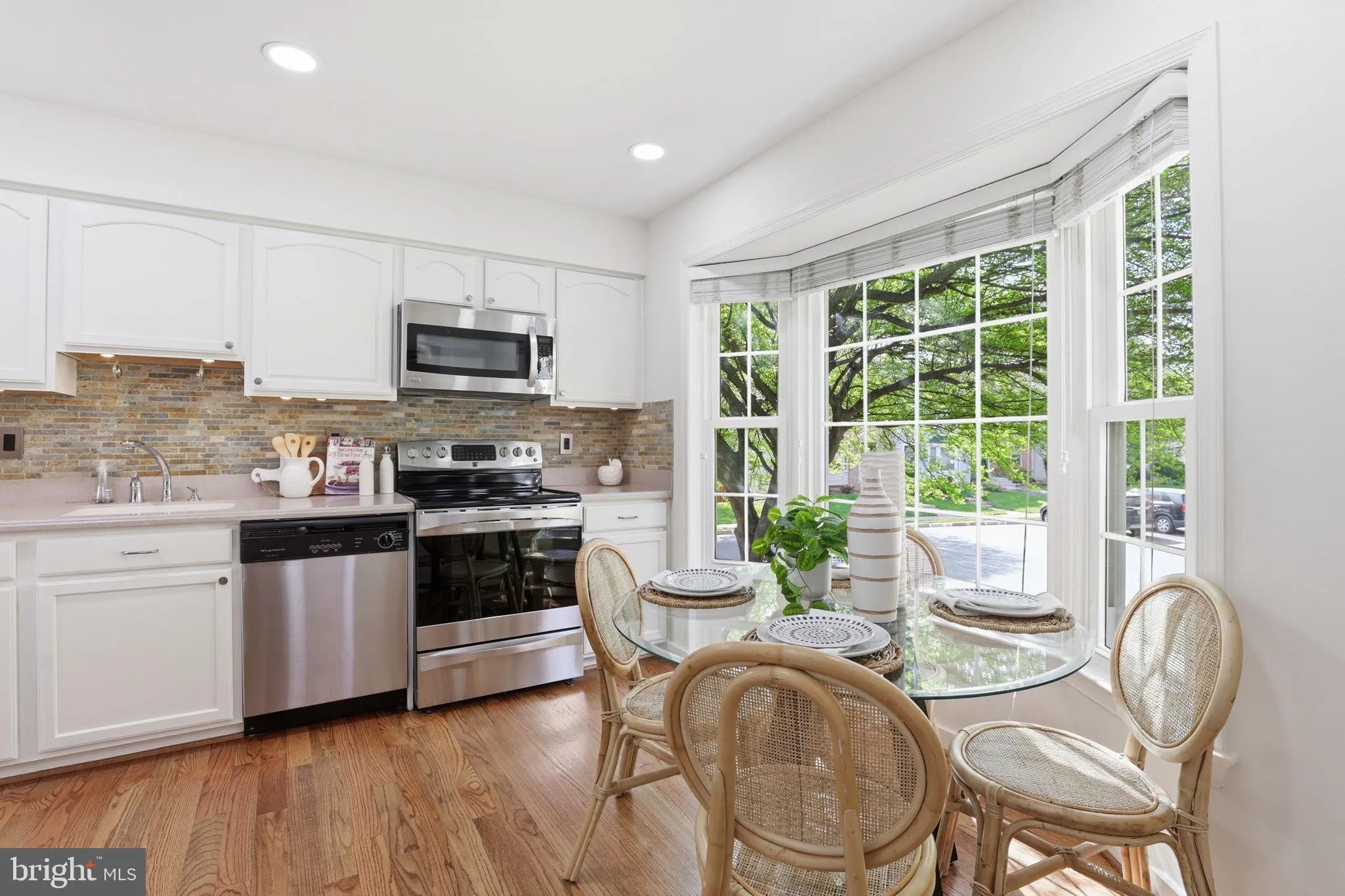 The kitchen is bright, functional, and actually a place you’ll want to linger, thanks to a bay window that naturally becomes your morning coffee spot, plus a pantry, stone backsplash, understated recessed lighting, and more of that beautiful hardwood flooring.