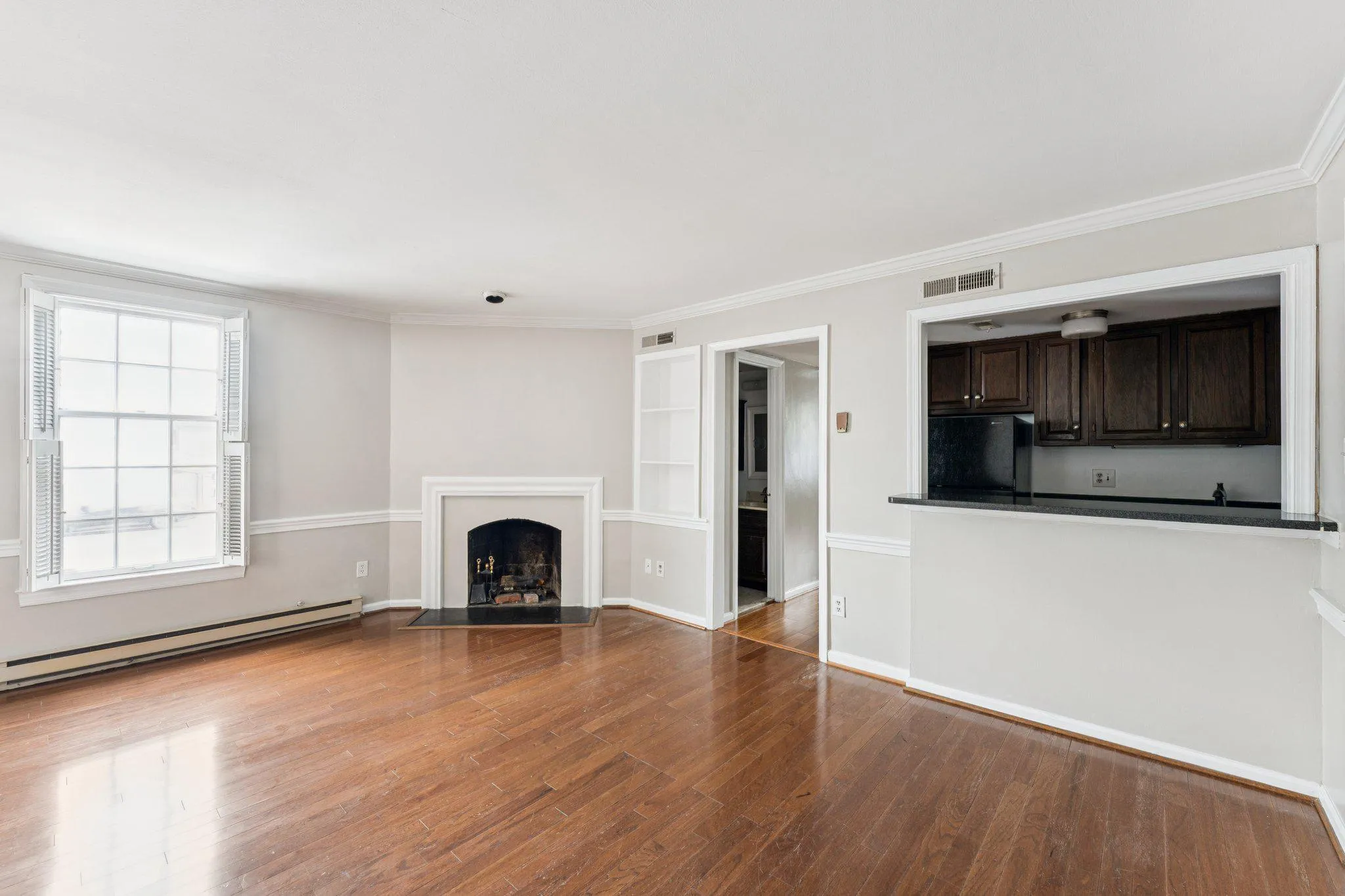 Cozy Living: The inviting living room is anchored by a wood-burning fireplace, an upscale touch perfect for chilly Virginia evenings.