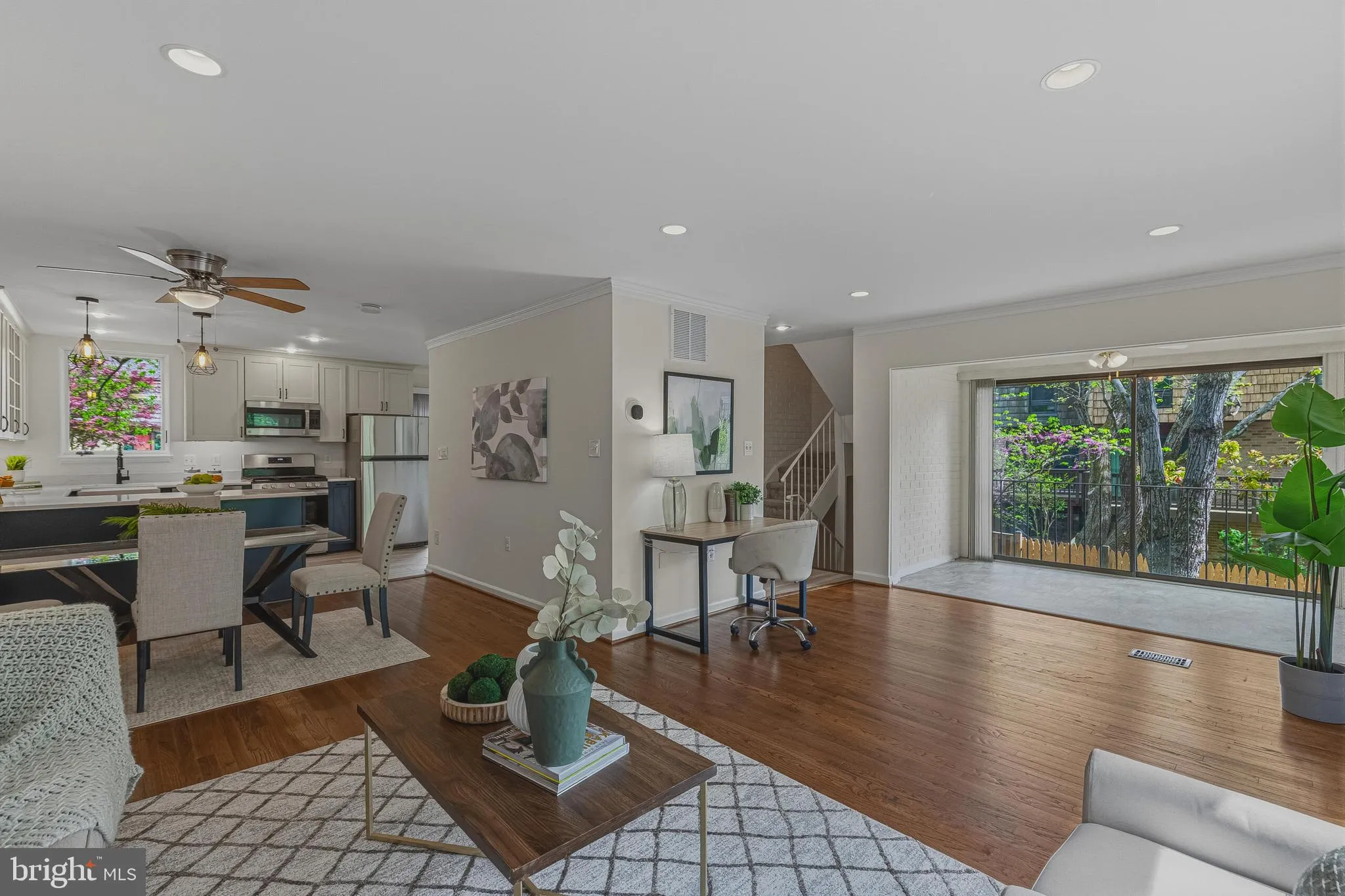 Beautiful end-unit townhome offering 3 bedrooms, 2 full baths, and 2 half baths in the sought-after Inverness Forest community. The sun-filled main level features an open-concept layout with hardwood floors, a spacious living area, and a beautifully updated kitchen complete with quartz countertops, stainless steel appliances, and a ceramic farmhouse sink – seamlessly open to the dining and living spaces, creating an ideal flow for both everyday living and entertaining. A dining area and breakfast nook provide flexible space, along with a convenient half bath.