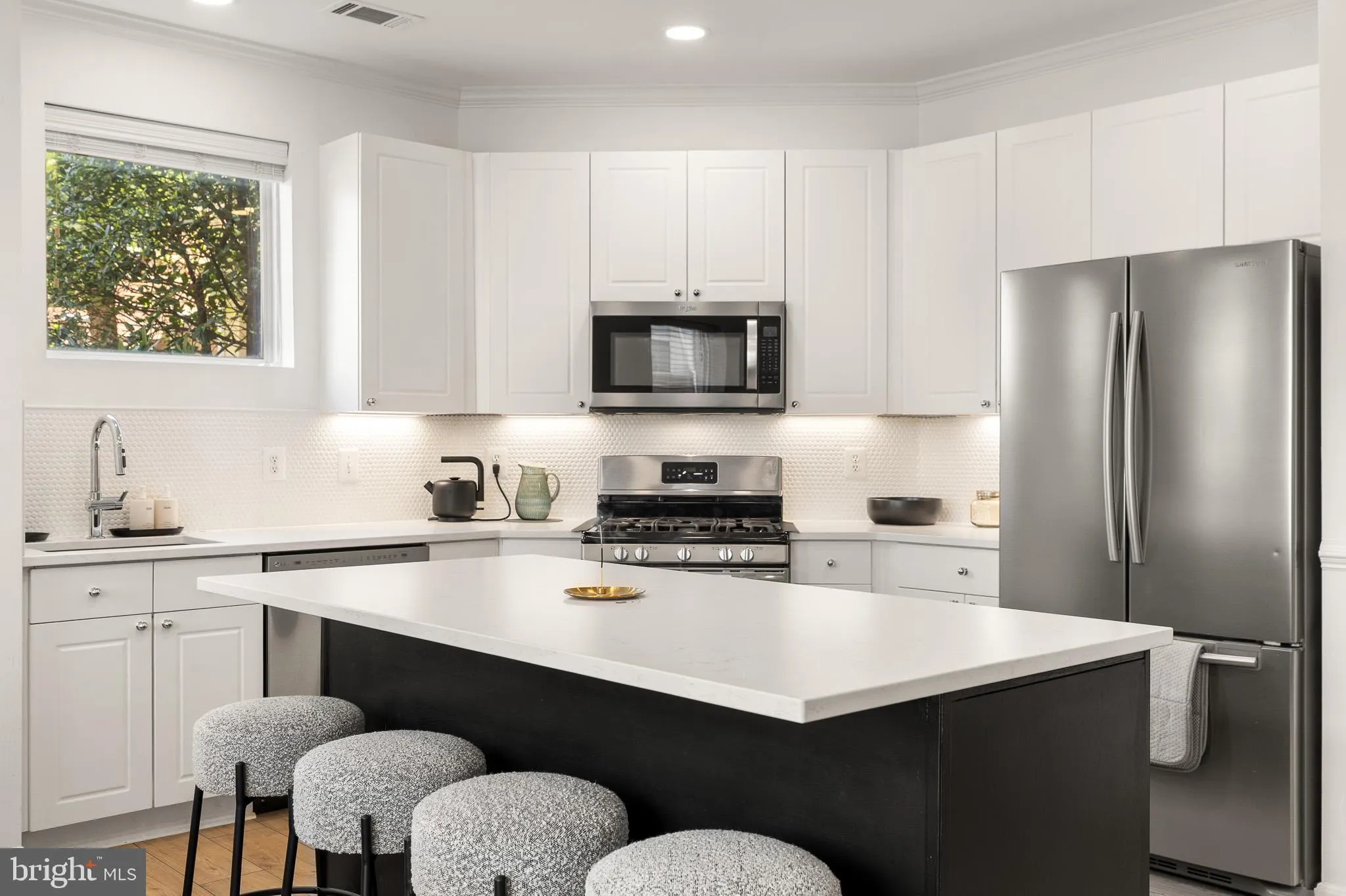 9486 Virginia Center Blvd #2, Vienna, VA 22181 offers ground-level living with direct walk-out access and a location near the crosswalk to the Metro. This 2-bedroom, 2-bath residence features an open layout with wide-plank flooring, recessed lighting, crown molding, and large windows that bring natural light into the main living areas. The kitchen includes a large center island with seating, white cabinetry, stainless steel appliances, gas cooking, under-cabinet lighting, and generous counter space. Both bedrooms are well-sized, including a primary suite with an updated en-suite bath featuring a glass-enclosed shower, modern vanity, and tile finishes. A second full bath, in-unit laundry, custom window treatments, and three reserved garage parking spaces add to the functionality of the home. Community amenities shown include a lobby, resident lounge, fitness center, and indoor basketball court.