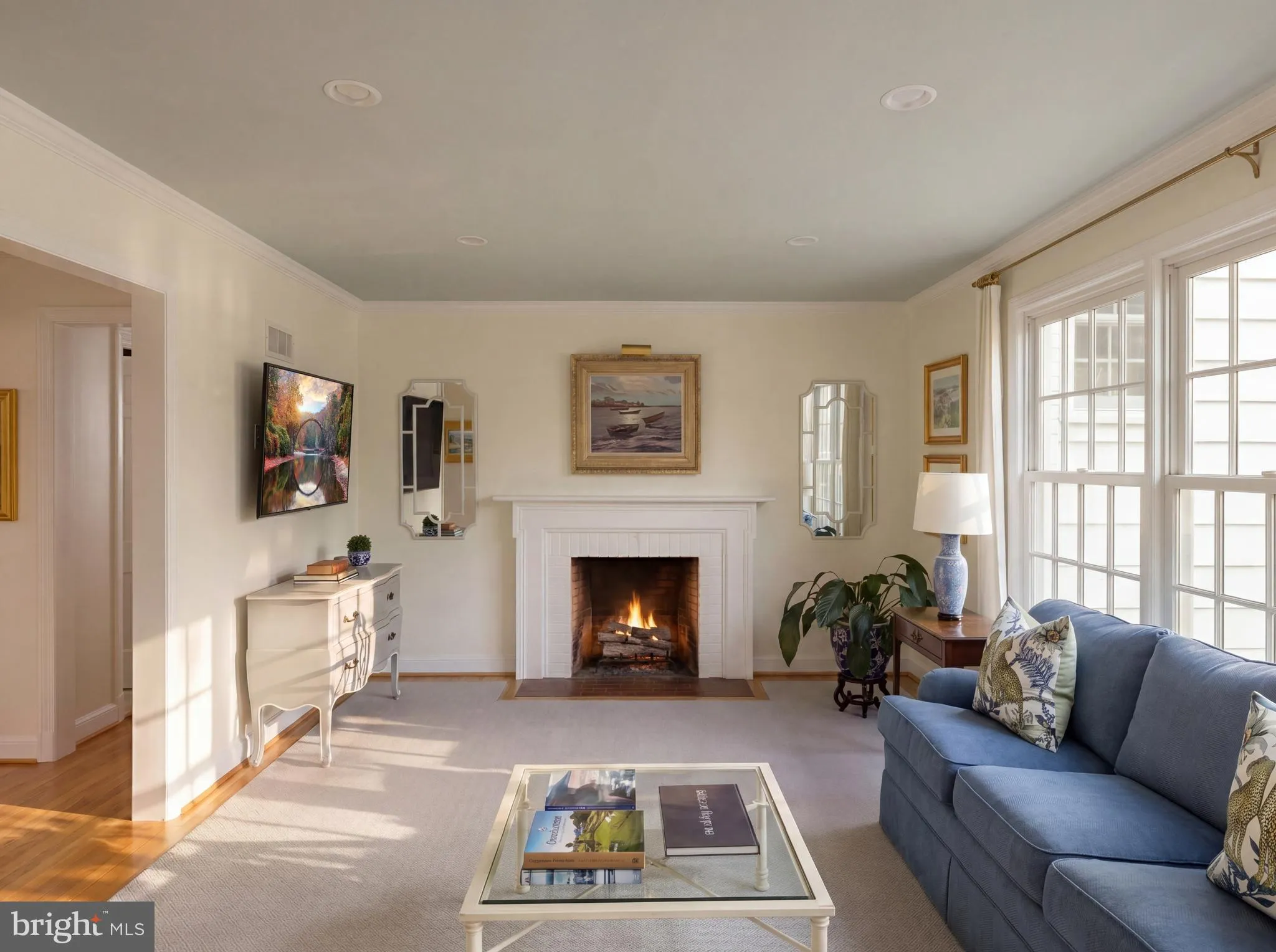 French doors extend the living experience to a covered, screened-in porch, creating a seamless dialogue between indoor and outdoor living. Surrounded by mature plantings, the setting feels both private and composed, while a stone terrace and garden path lead to the rear yard. A garden patio rests quietly beneath the trees, offering a peaceful setting for outdoor seating or quiet retreat. A secondary family room provides a more relaxed environment, anchored by a second fireplace, while a main-level bedroom with an en-suite marble bath offers versatility for guests or a private office.