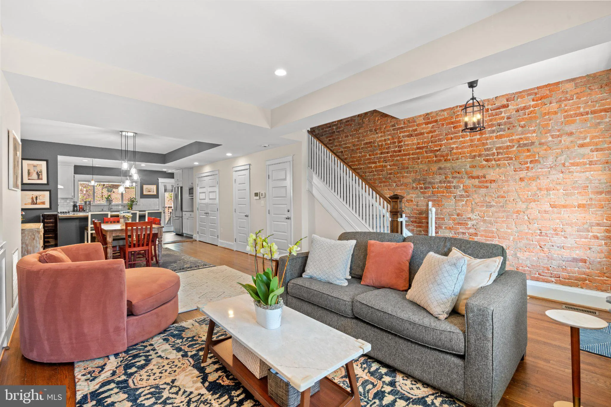 Welcome home to 919 Quincy St NW, an exquisitely reimagined Wardman style rowhome that seamlessly blends timeless architecture with elevated modern design. Step off of your charming front porch with swing and into a light-filled, open-concept layout featuring original exposed brick. The generous living room is highlighted by custom built in shelving and leads to a spacious dining room that features beautiful wallpaper and light fixture. Just beyond is a large kitchen that features stainless steel appliances, quartz counter tops, a coffee nook and a large peninsula with casual seating. Step out of the kitchen into a beautiful backyard that features a stone patio, grass area and off-street parking with garage door. A powder room rounds out the main level.