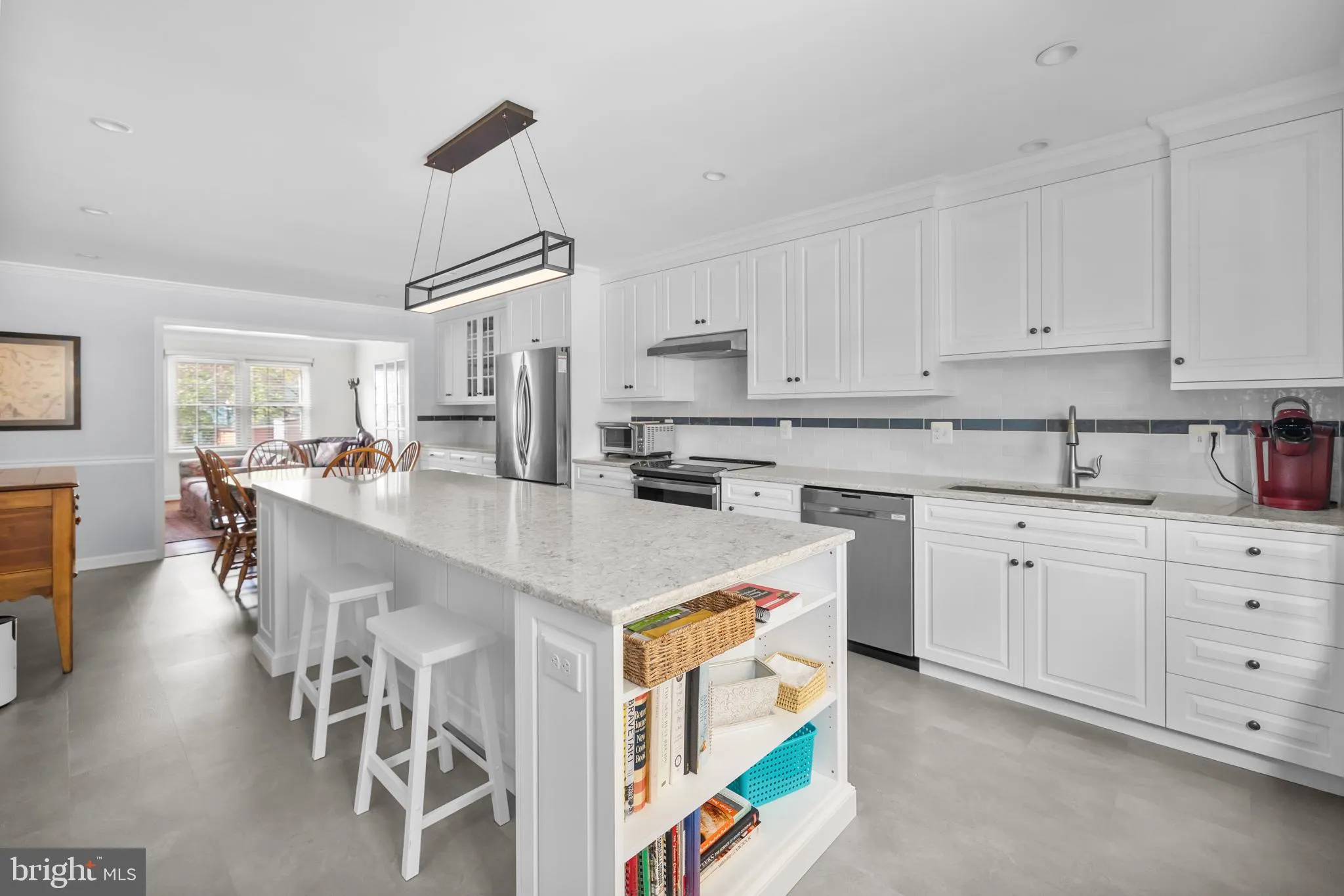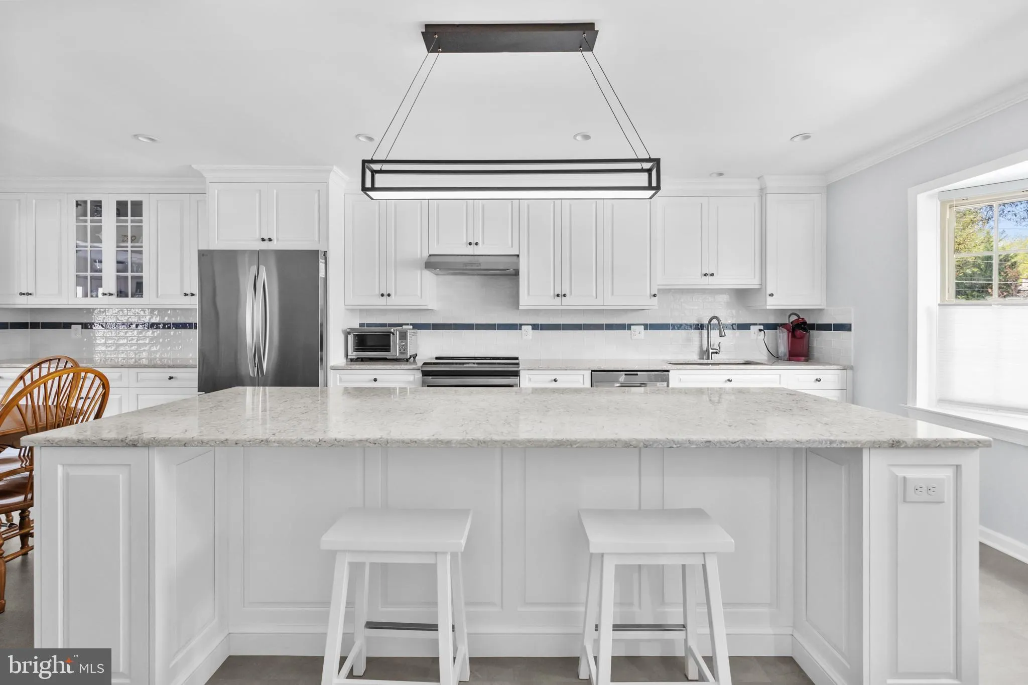 From the moment you step inside, the quality of the 2024 renovation is evident. The chef’s kitchen was rebuilt with custom soft-close cabinetry, a nine-foot island, Silestone counters, and a full suite of smart appliances including the refrigerator, oven, and dishwasher. A touchless faucet, USB outlets, and a wired pantry complete the picture. The wall between the kitchen and living area was removed, opening the entire main level into the kind of connected layout today’s buyers are looking for. A gas fireplace and updated powder room round out the main floor.