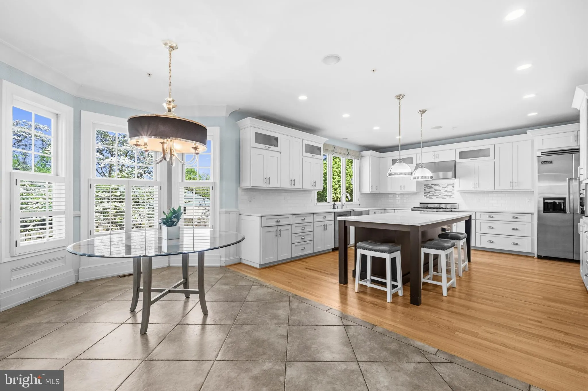 Step inside to discover a warm and inviting atmosphere, accentuated by rich wood floors and elegant crown moldings. The open floor plan seamlessly connects the gourmet kitchen to the family room, creating an ideal space for gatherings. The kitchen is a chef’s dream, boasting upgraded countertops, a six-burner gas stove, double wall ovens, and a butler’s pantry. Enjoy casual meals in the eat-in kitchen or host formal dinners in the dining/living area, where natural light pours in through stunning bay windows.