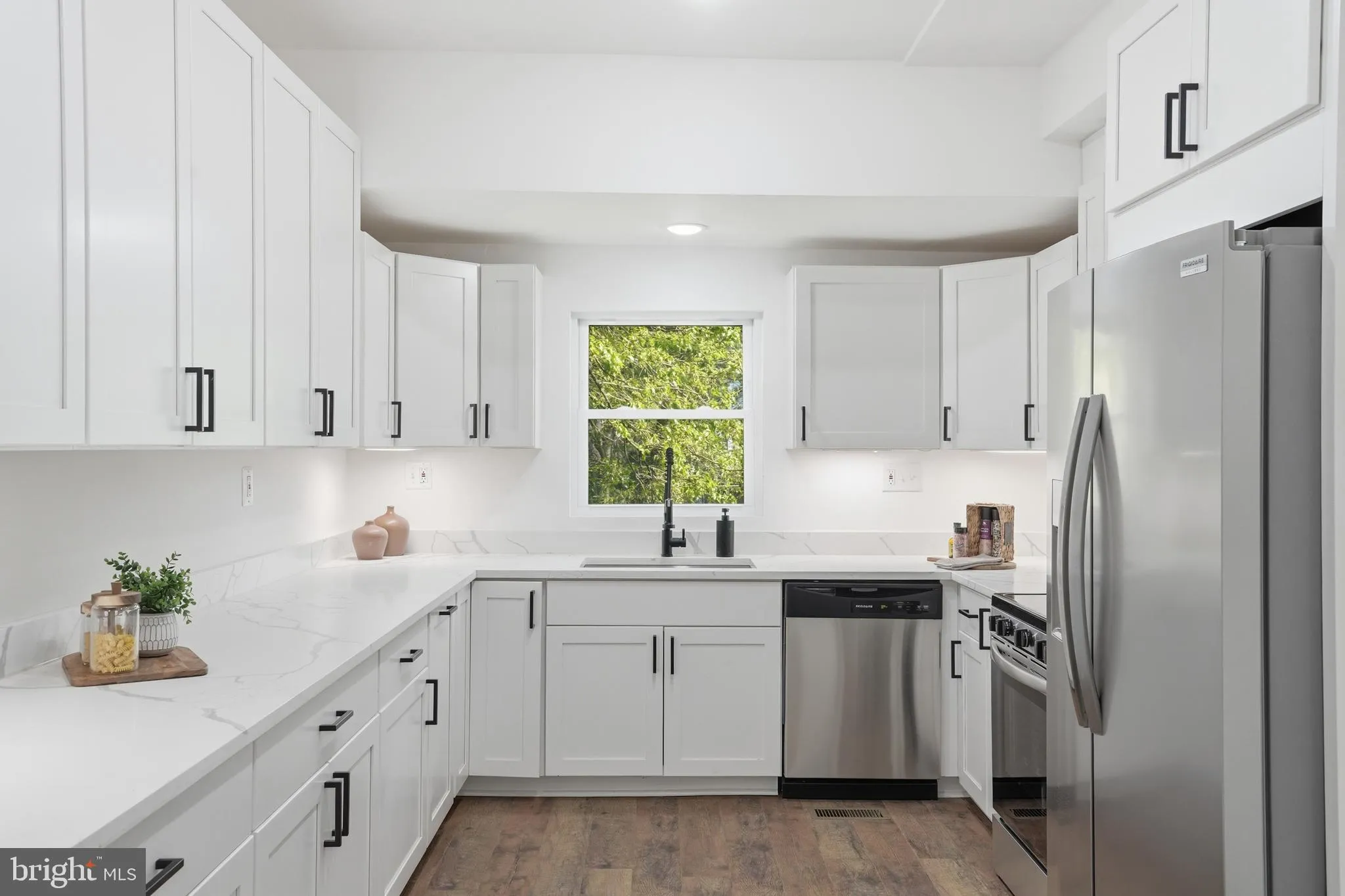 Inside, the home has been completely transformed with a bright, open layout, wide-plank flooring, and abundant natural light throughout. The main level flows effortlessly from living to dining, anchored by a fully renovated kitchen featuring quartz countertops, shaker cabinetry, stainless steel appliances, and modern finishes—designed for both daily living and entertaining.