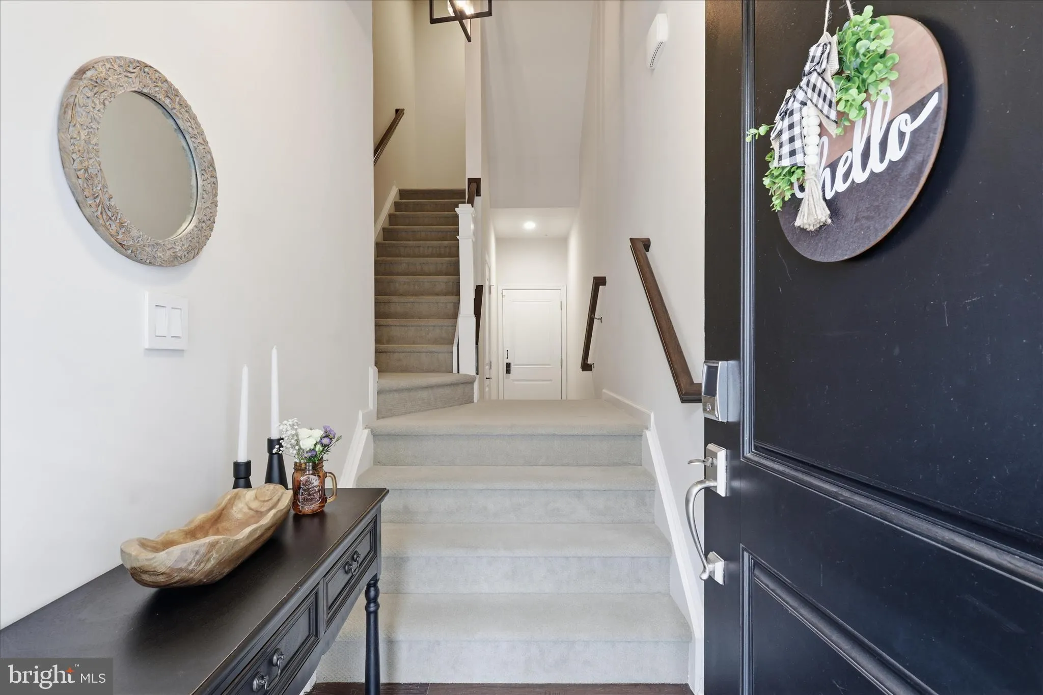 Upstairs, the expansive primary suite serves as a relaxing retreat with a tray ceiling, private balcony, oversized walk-in closet, and a spa-inspired en-suite bath complete with a soaking tub, sleek vanity, and frameless glass walk-in shower. Two additional spacious bedrooms share a beautifully updated hall bathroom, while the upper-level laundry room adds everyday convenience. Additional highlights include smart home features such as smart locks, switches, and an Ecobee thermostat, designer lighting and chandeliers, and a freshly painted one-car rear-load garage with a private driveway and ample guest parking.