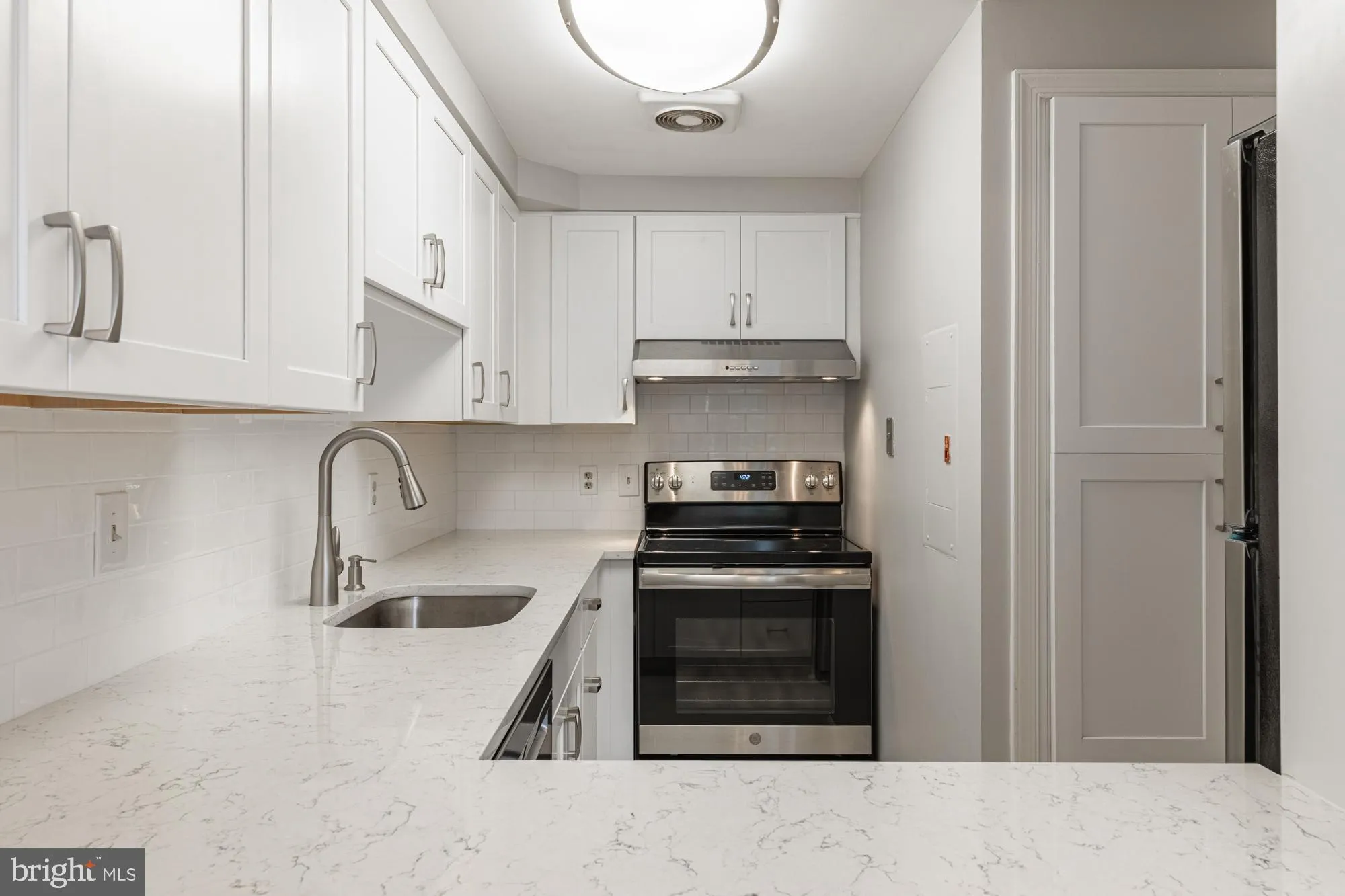 Towering two-story living room windows bathe the entire condo in natural light and open to a serene private patio with views of lovely courtyard gardens. Features laminate “wood” flooring and a wood-burning fireplace with a two-story architectural mantel. Freshly painted throughout. The completely renovated kitchen appliances, finishes, HVAC, and water heater are approximately 5 years old. There is a generous pass-through window to the living room showing the sleek quartz countertops, stainless steel appliances, large sink and hardware, ample cabinets, subway backsplash, and the ceramic tile floor. The washer and dryer are located in the kitchen closet.