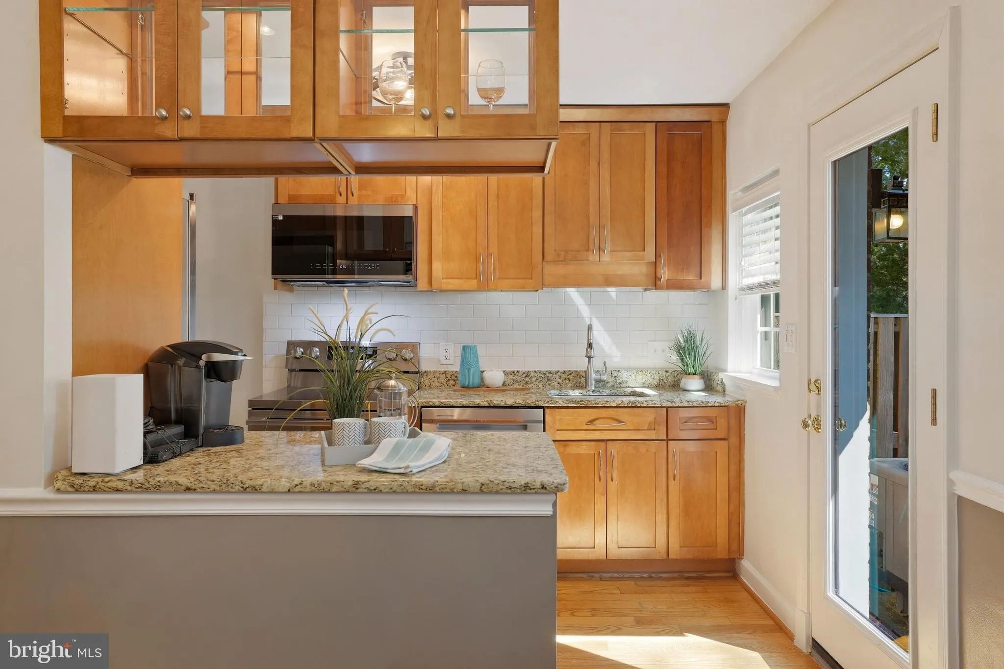 The main level offers a bright, open layout with beautifully maintained hardwood floors and elevated ceiling height that enhances the sense of space and light. The kitchen combines a functional layout with quality cabinetry, stone countertops, a timeless backsplash, and new appliances including a convection oven and refrigerator that makes craft ice.