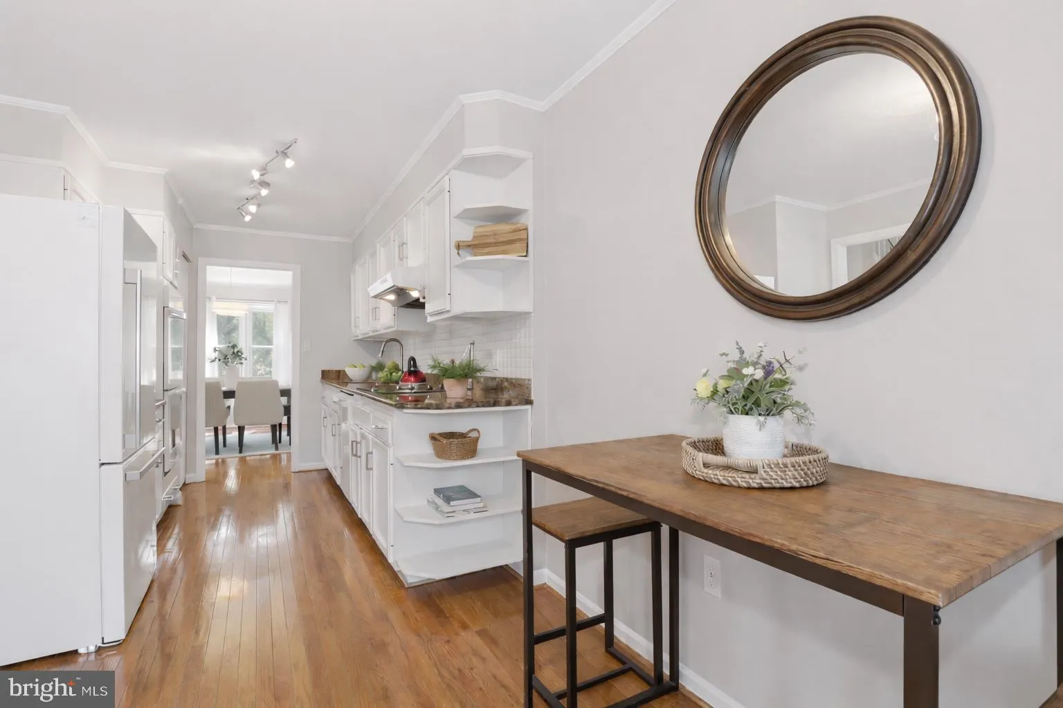 The bright white kitchen is filled with natural light and thoughtfully updated with a new refrigerator, double wall ovens, updated cooktop, granite countertops, new vent, hardware, and light fixtures. A large pantry and a charming breakfast room with a garden window complete the space. The main level flows seamlessly, with a separate dining room opening to a spacious living room highlighted by oversized windows that fill the home with light.