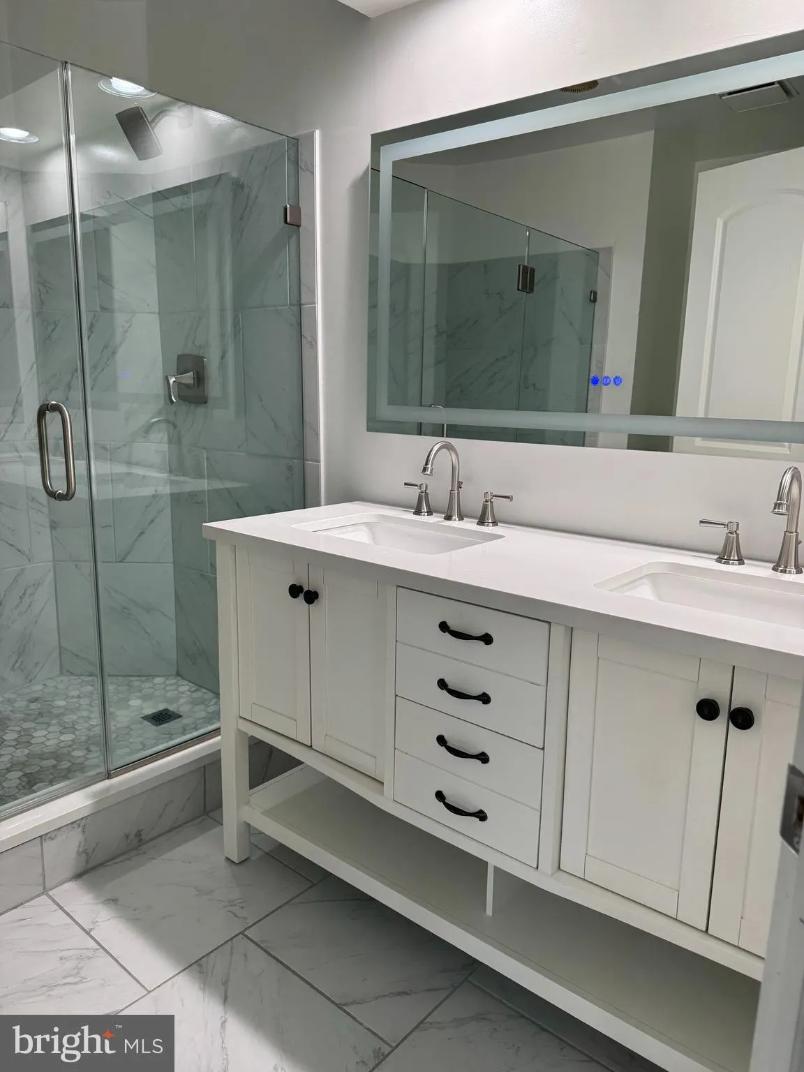 The primary bedroom includes a spacious walk-in closet and an en-suite bathroom with a double vanity and soaking tub. A washer and dryer are conveniently located in the unit.