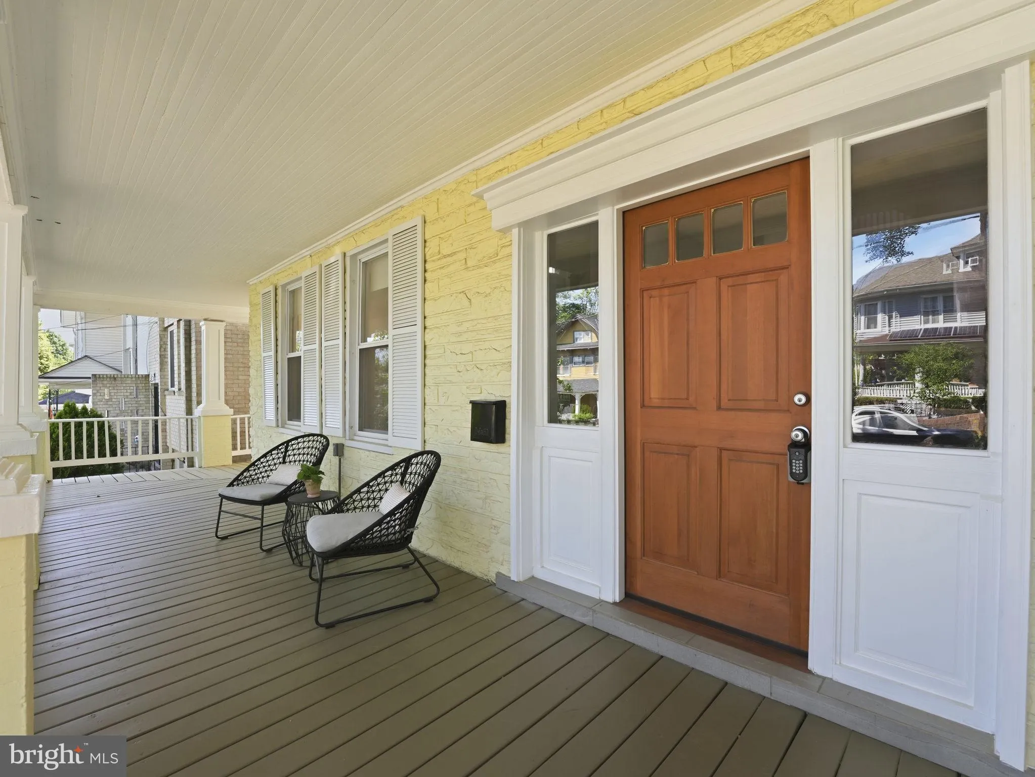 A welcoming wraparound front porch leads into a grand, light-filled foyer with original parquet flooring that extends through the formal dining room and expansive living room. The main level features soaring ceilings, abundant natural light, and an elegant, functional flow. The well-proportioned living room showcases coffered ceilings, bay windows, and a fireplace with wood-burning stove, while the sun-filled dining room is ideal for entertaining. A convenient powder room and a unique double staircase—accessible from both the foyer and kitchen—complete this level.
