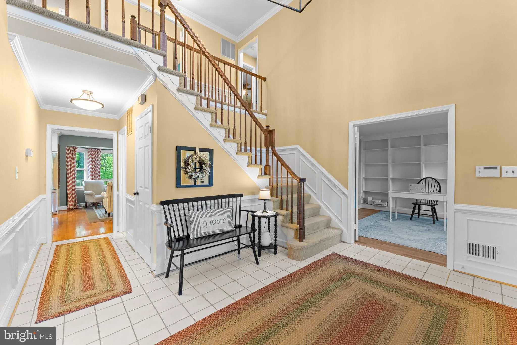 Inside, the home opens to a welcoming foyer with a sweeping staircase and a layout that gives you flexibility from the start. To one side, a private office with built-in bookshelves is ideal for working from home or a quiet reading space. On the other, a generously sized dining room is ready for everything from holiday dinners to casual weeknight meals, with a barn door that opens to an additional living space you can tailor to your needs, whether a formal sitting room, playroom, or whatever fits your lifestyle. The flow between these spaces makes it easy to host, gather, or simply spread out.