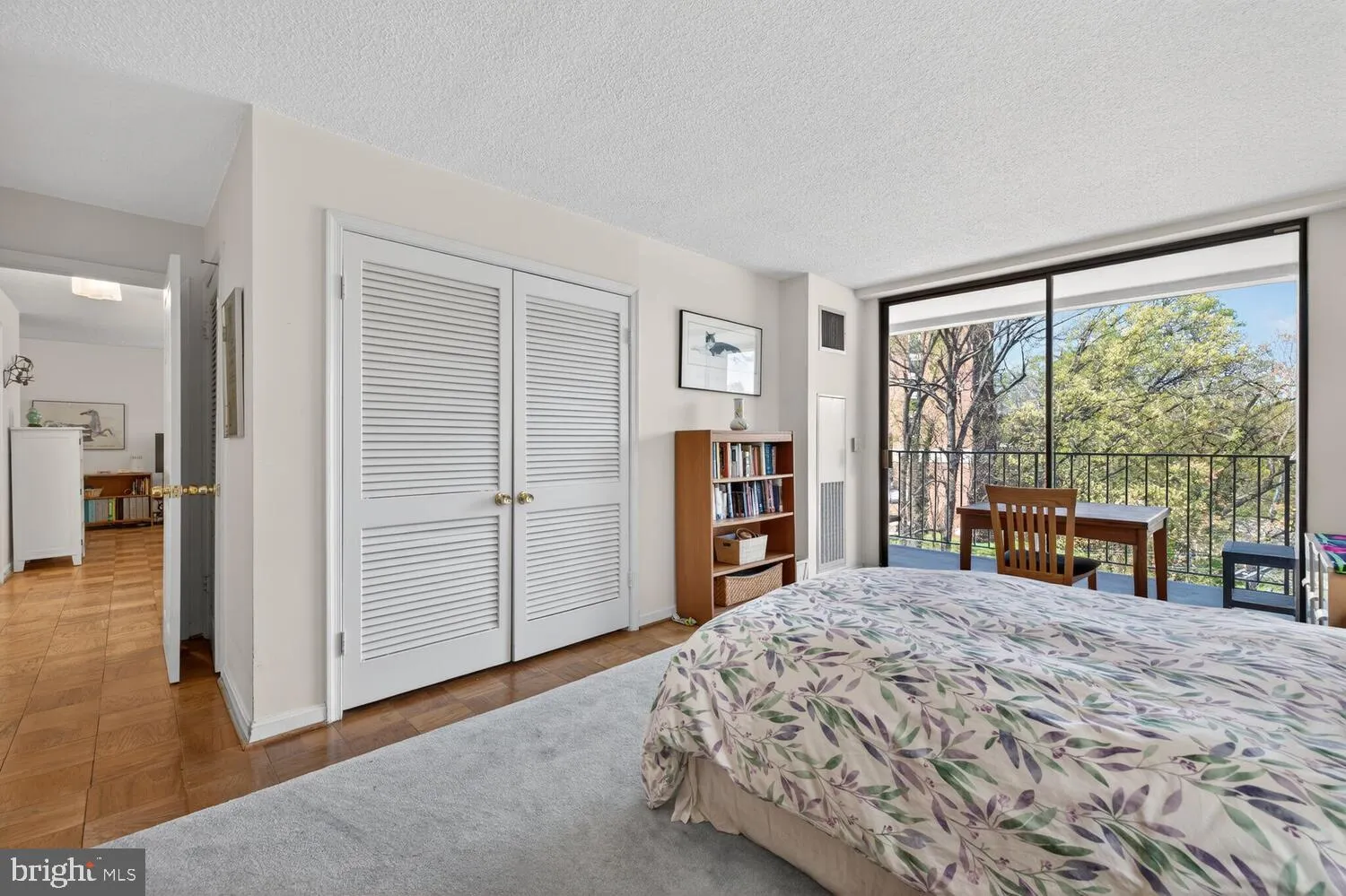 Both bedrooms are well-sized with ample closet space, and the primary bedroom provides direct access to the balcony. The layout offers a comfortable separation between living and private spaces.